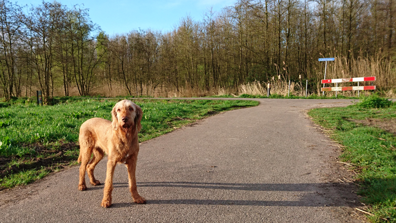 Vandaag is het weer tijd voor een lekker rondje met woef. Omdat ik er al 55 km op heb zitten met de afgelopen drie dagen, ga ik ook voor een kort rondje. We starten bij de golfbaan omdat ik wel weet welk rondje ik goed met haar kan doen nu. Om wat harde stenen te vermijden, lopen we eerst over het fietspad richting de dijk. Ineens springt woef naar de kant van het water en blaft. Het volgende moment hoor ik boos blazen. Een zwaan! Dat doet ze eigenlijk nooit en ik wist ook niet dat daar (al) een zwaan zat te broeden. Ik zie 1 ei onder de zwaan die boos naar woef blaast. Gauw doorlopen en ik moet dit dus even goed onthouden voor een volgende keer. Grappig genoeg krijgt wafje weer veel meer belangstelling voor veerwild. Blijkbaar voelt ze zich goed. Tijdens de vorige run rende ze ook ineens achter een zwaan aan. Ik schrok me toen rot want een klap met een vleugel en we hebben een probleem. Ik was er niet op bedacht omdat ze dat normaal niet (meer) doet/deed maar blijkbaar heeft madam ineens door dat het erg leuk is om even te doen waarvoor je gefokt bent. Nee dus. Stout.