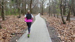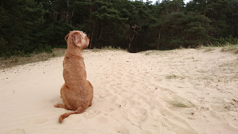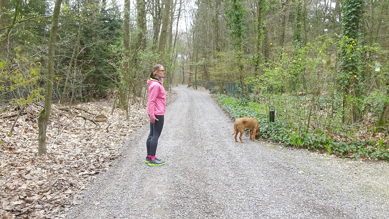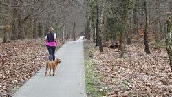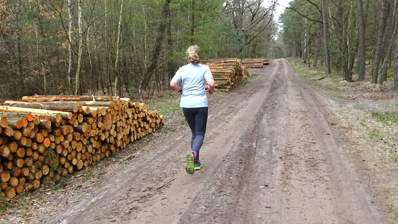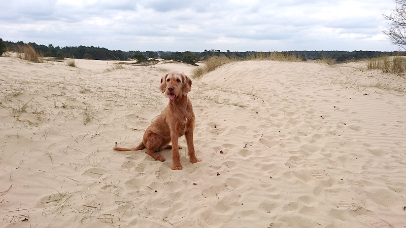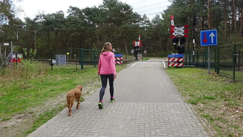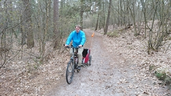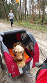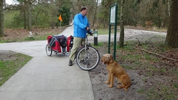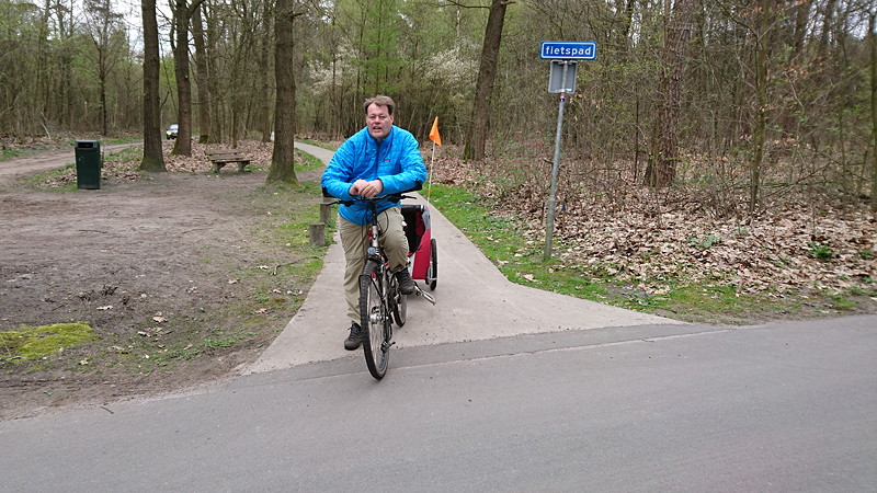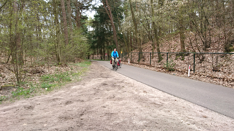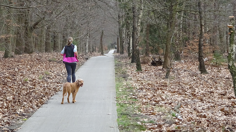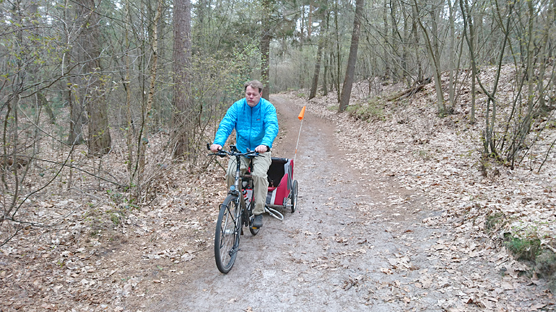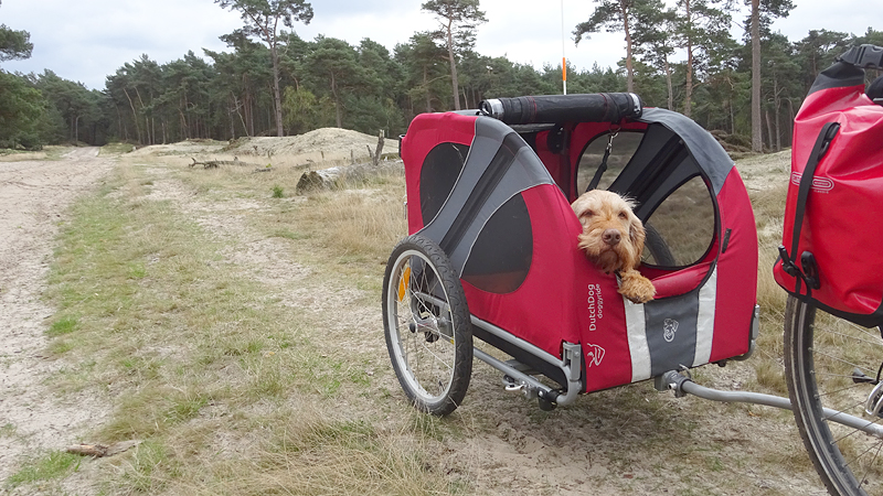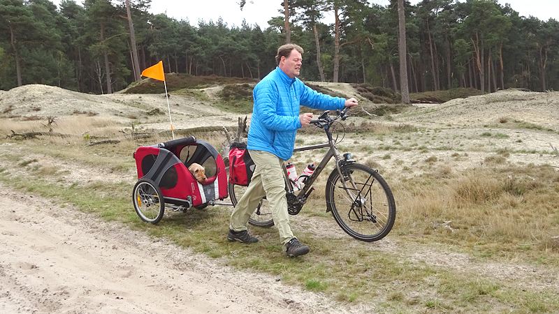 Daarna weer verder. Ik koos voor rustige 500-tjes om een lage hartslag te houden en dat ging prima. Na een kleine 5 km doen we woef voor de zekerheid in de kar. Daarna fietsen we verder over het fietspad en slaan op een gegeven moment rechtsaf. Als we daarna weer rechtsaf slaan, lopen we ineens door een stukje bos. Van zandverstuiving naar heide en daarna naar bos. Mooi afwisselend! Helaas stuiten we ook op een deel van het pad waar S. niet met de fiets en de kar doorheen komt en die arme stakker trekt de kar door het zachte zand. Ik hobbel heel langzaam verder en wacht daarna even tot hij weer bij me is en weer kan fietsen. S. snottert ook zielig dus dat is al dubbel vervelend allemaal.