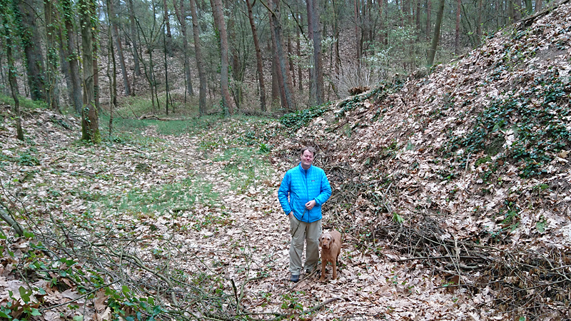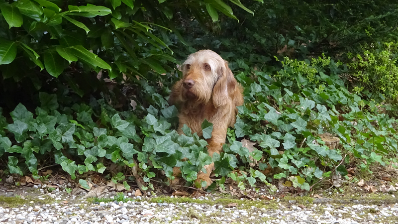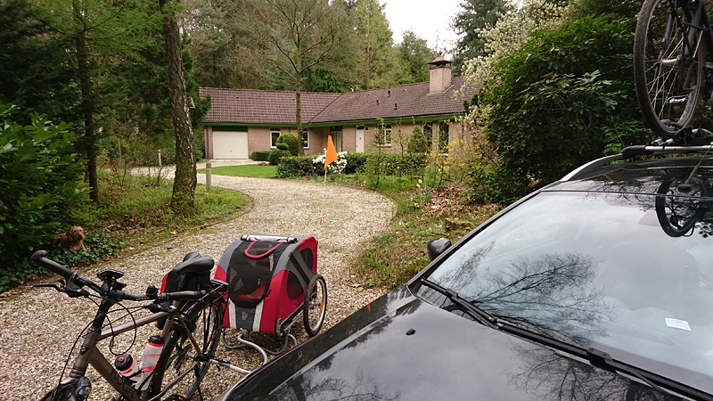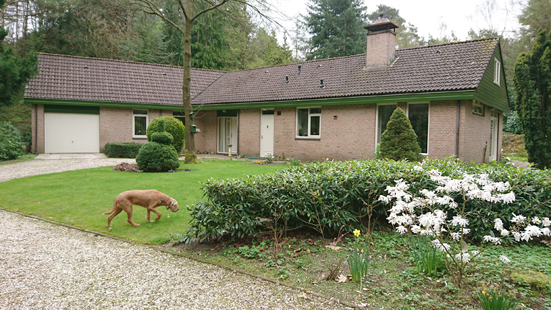 We halen wafje uit de kar voor het laatste stuk en besluiten even door dat Belvederebos te lopen om te kijken wat dat nu precies voorstelt. Het blijkt nog een heel aardig bos te zijn en we lopen er nog een paar kilometer en staan daarna met 15 km weer voor de deur. Wafje liep ongeveer 10 km mee en dat ging allemaal prima. Eerst nu nog even de tuin bekijken en als de bewoner thuis is ook nog een iets nameten op de zolder. Helaas is er de hele dag geen zon geweest en kunnen we nog niet zien hoe het licht valt op het huis!