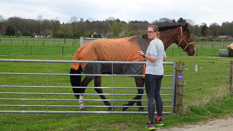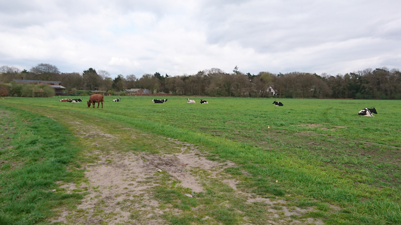 Als we weer het spoor over gestoken zijn, komen we iemand tegen met een hond aan de riem en die schiet ik even aan om te praten over de snelweg, boodschappen doen en de zondagsrust in dit gebied. Dat is altijd nuttig en met nieuwe informatie lopen we weer verder. Eerst even langs mooie huizen en daarna langs een open veld waar ik de route volg over het gras en S. met de kar omheen fietst. Ik kom nog leuke koeien tegen die gelukkig achter schrikdraad staan. Dat konden we niet goed zien maar ze staan niet zomaar los.