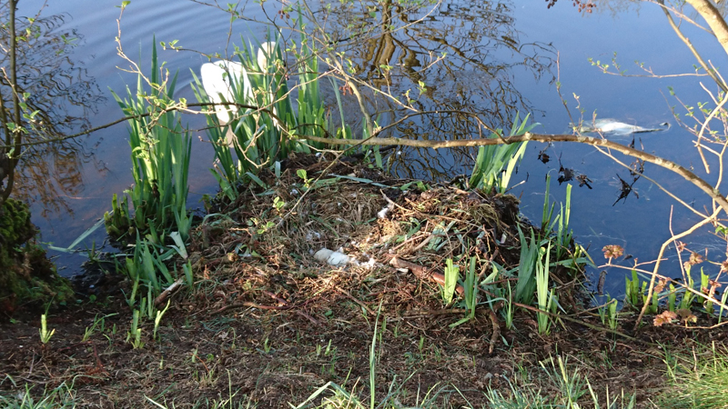 Ik zie ineens mijn hartslag en moet lachen. Ergernis! Als ik klaar ben met de lap start ik met de cool down en loop nog even langs het water voor woef. Kan ze nog even lekker snuffelen en plassen. Bij de golfbaan is het zwanen nest weer even onbemand omdat de ouderdieren zwemmen en dus loop ik langs om te kijken. Drie eieren zie ik nu al liggen!