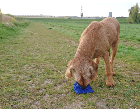 Ik loop een stukje over de dijk en woef loopt braaf mee aan de riem. Vreemd genoeg heeft ze nog niets gedaan tijdens de warming up dus dat loopt vast niet zo lekker voor haar nu. Ik kijk naar de lammetjes en ineens realiseer ik me dat ik de voetstapjes van woef niet meer hoor. Ik kijk om en ik zie dat ze net achter me loopt omdat de riem tussen mijn band is weg geglipt. Dat is dus niet handig en nog gevaarlijk ook. Nu kwam er gelukkig niets over de dijk. Voortaan dus beter vastmaken!