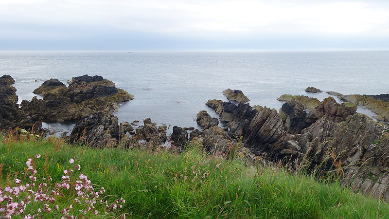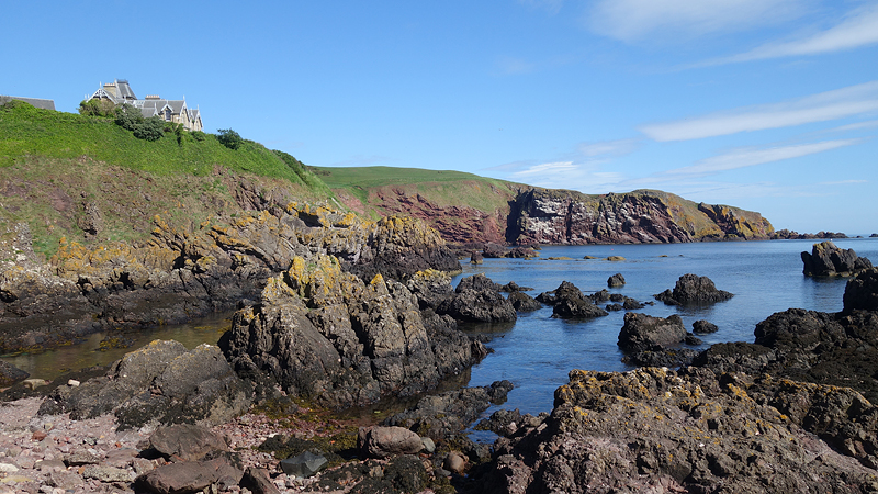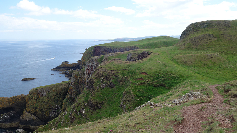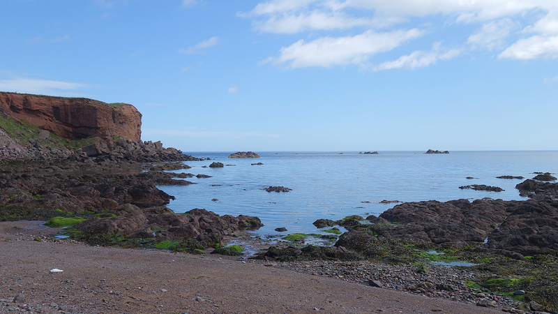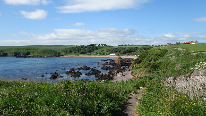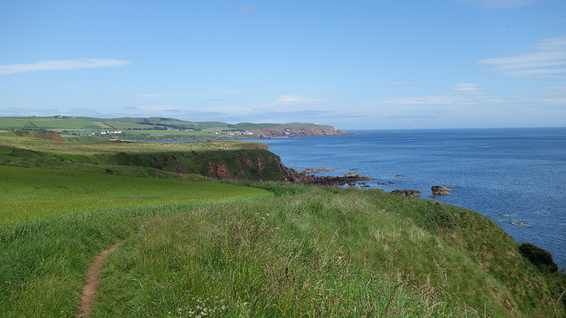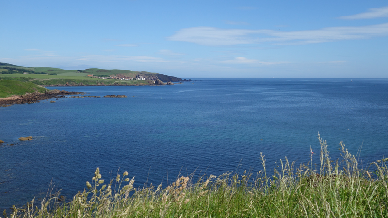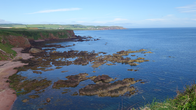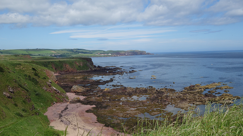 We schieten best lekker op eigenlijk. De route van St Abbs naar Eyemouth is maar 6 km dus heen en weer is maar 12 km. Als wafje het goed doet, kunnen we vanaf St Abbs straks een stukje verder de route vervolgen richting St Abbs head. Ik heb alleen geen idee of zij (en ik) dat kan. Eerst maar eens Eyemouth halen! Het gaat allemaal niet snel door het badderen, het genieten van het uitzicht en het foto’s maken. Maar waar ik loop, kan ik ook wel goed doorlopen want de paden zijn eigenlijk prima. Dat valt me echt enorm mee want een deel van de John Muir Link is gewoon bijna niet beloopbaar.