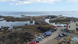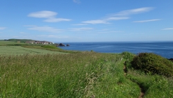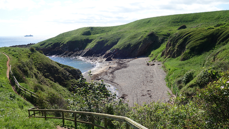 We nemen afscheid en ik zoek het eerste bordje van de route. Dat zie ik al snel en ik loop naar boven het dorpje uit en heb mooi uitzicht over het haventje achter me in de diepte. Het is druk daar met veel duikers ook. Natuurlijk is de reddingsboot het meest prominent aanwezig daar en veel mensen dragen een shirt van de reddingsbrigade.