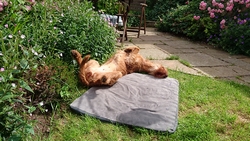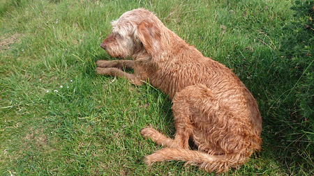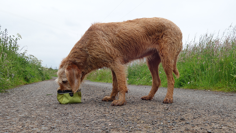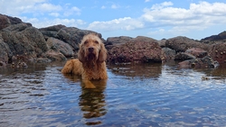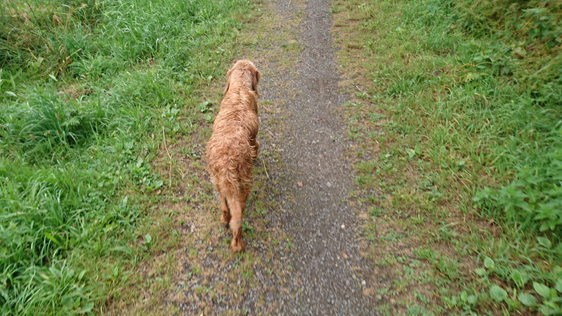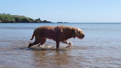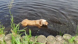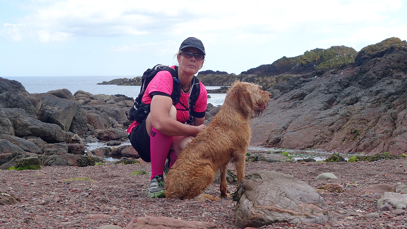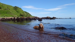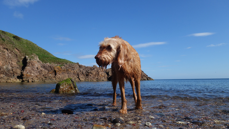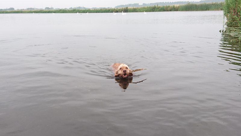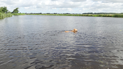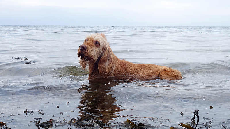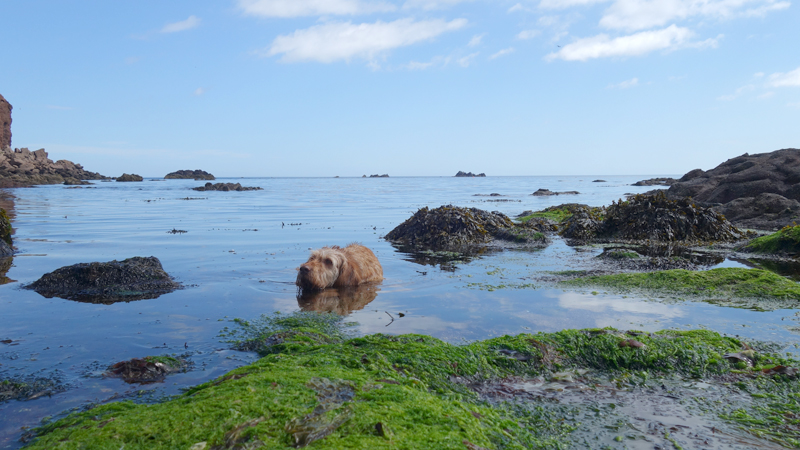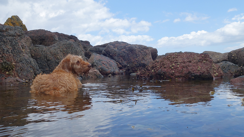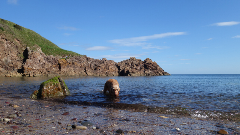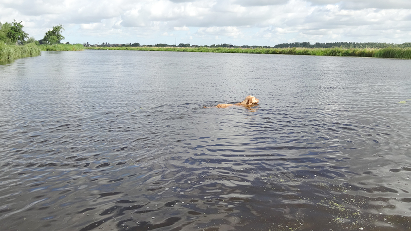 We hobbelen verder en komen alweer bij een baaitje uit waar woef even kan badderen. Ze heeft dit vandaag ook echt nodig want het is 25 graden met volle zon.