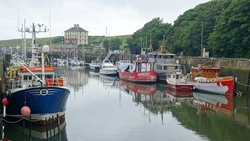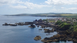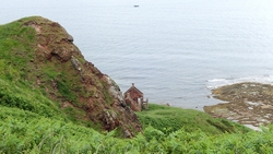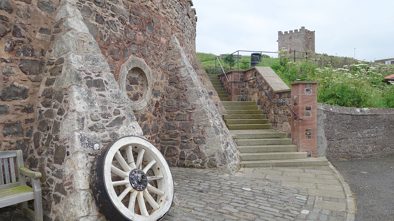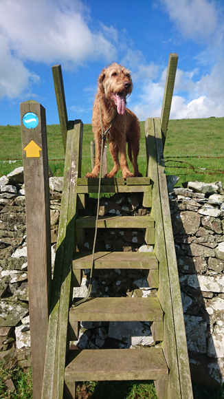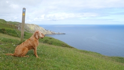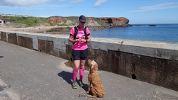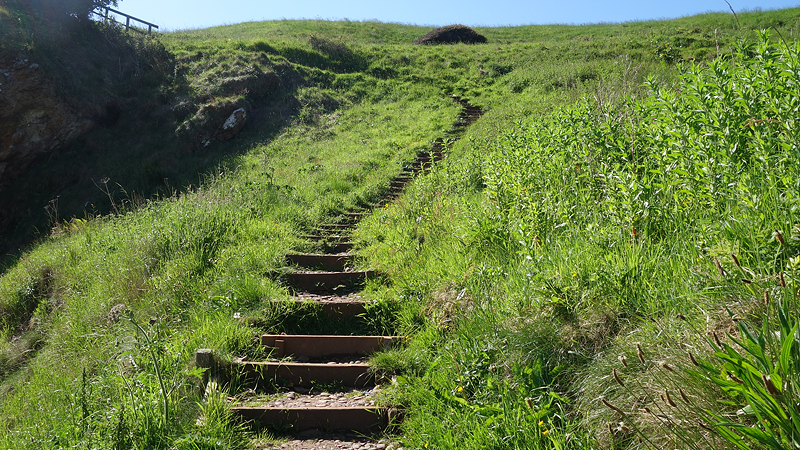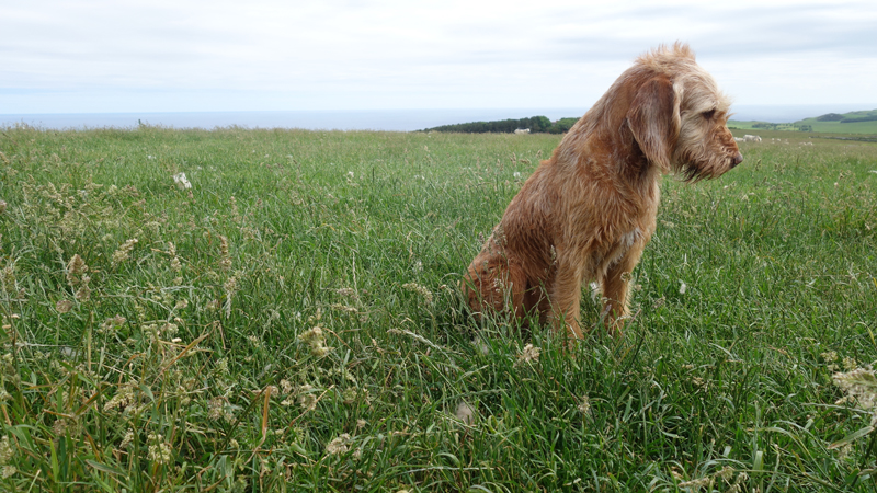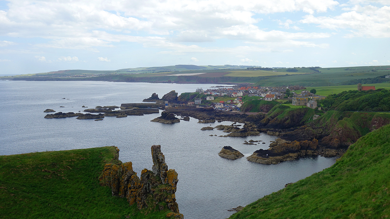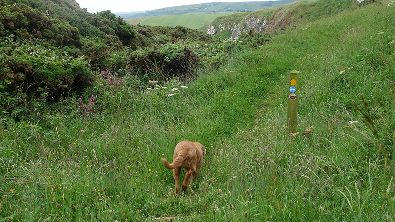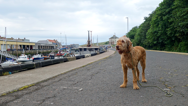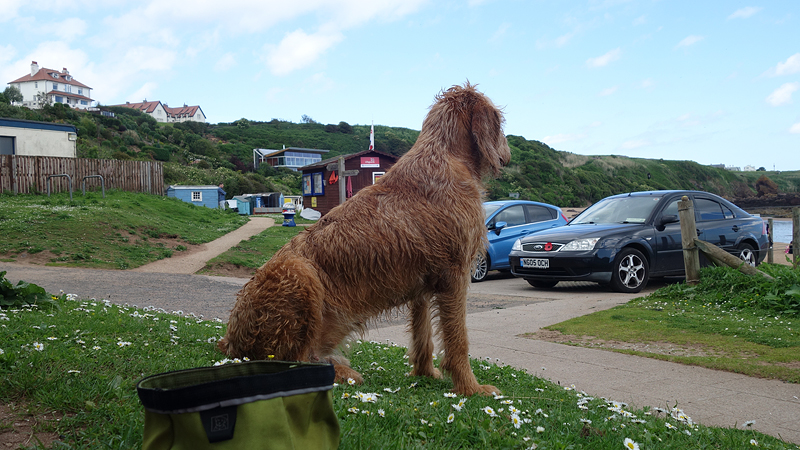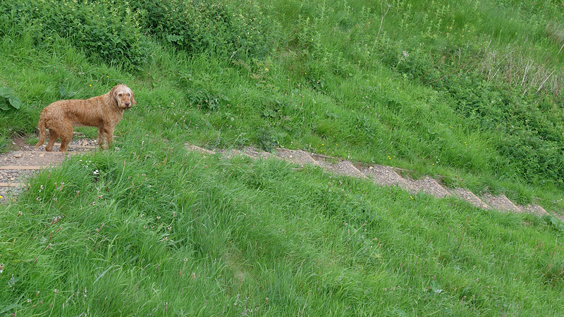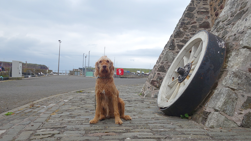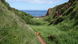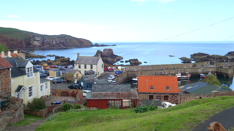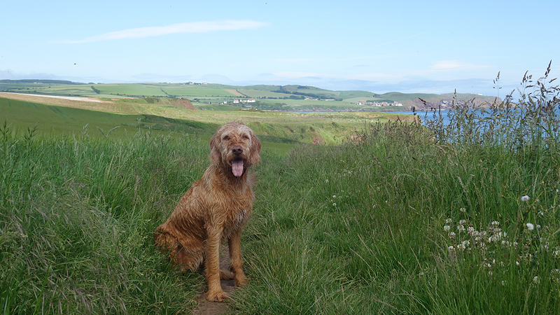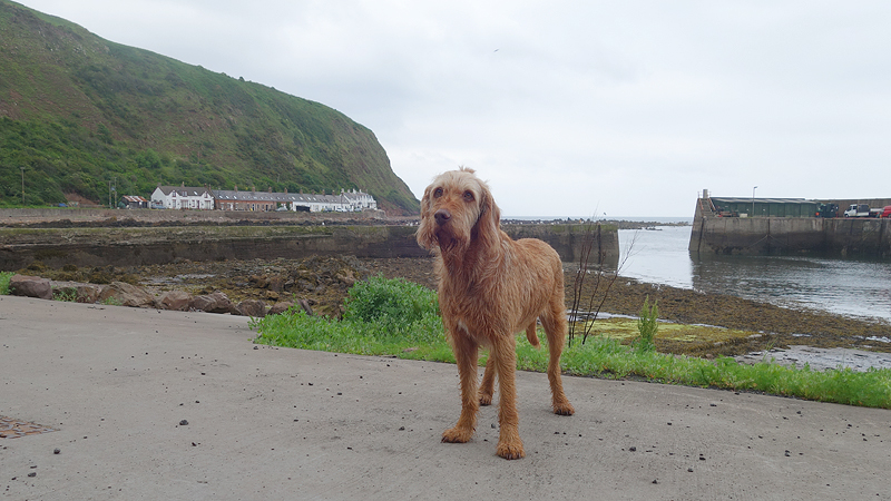 Als we wat zijn uitgerust gaan we weer op pad. Ik moet even zoeken naar de route want ik kan vanaf het strand de trap niet vinden maar een aardige dame wijst me de weg. Wafje klimt braaf de trappen op. Vanaf daar is het nog maar een heel klein stukje voordat we alweer uitzicht hebben over St Abb en het haventje.