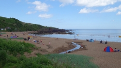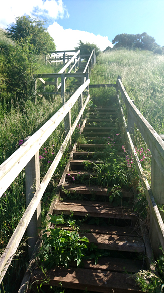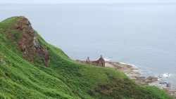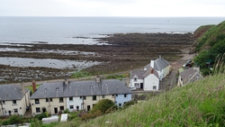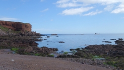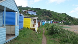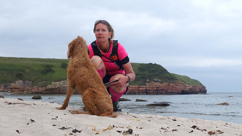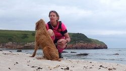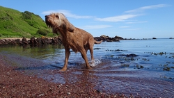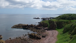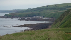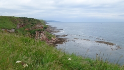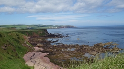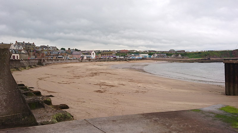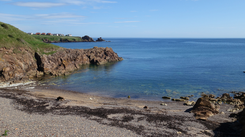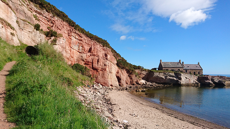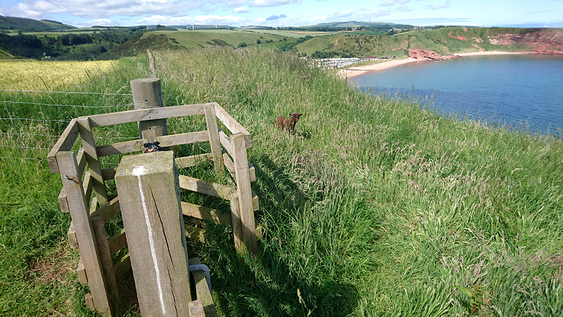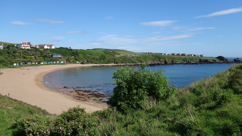 Al snel lopen wafje en ik weg van st abbs. Onze eerste stop zal nu het strandje bij Coldingham bay zijn waar ze even kan badderen. Na wat klimmetjes en afdalingen staan we bij het strand waar het nu nog heel rustig is. Ideaal. Wafje gaat even als zeehond in het water liggen en ik wacht dus even af en kijk om me heen. Er zijn al wat kinderen aan het spelen bij de gekleurde strandhuisjes. Verderop zie ik de route omhoog slingeren over een pad met treden. Ik ben benieuwd.
