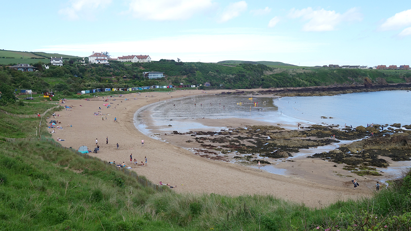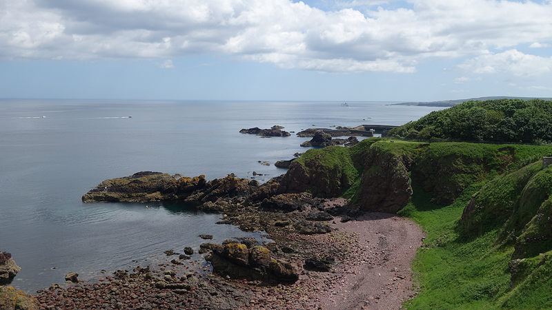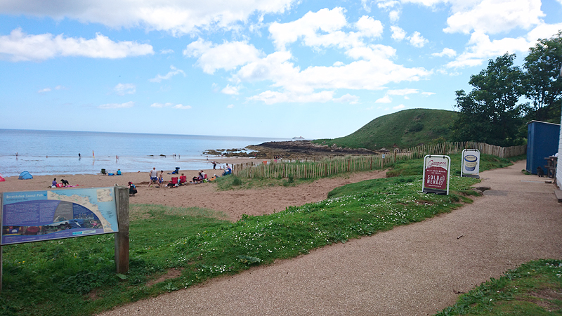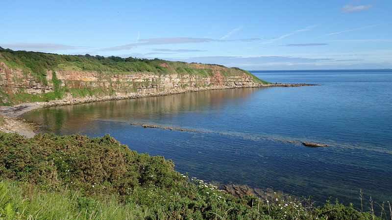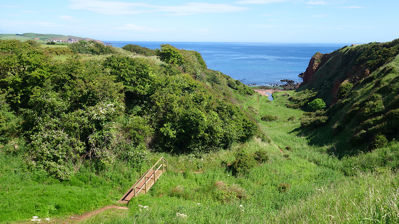 We lopen door naar het eerste strandje en omdat het daar druk is, lopen we even door en gaan niet naar de water rand. Daarna hobbelen we weer de treetjes af naar het strandje naar Coldingham Bay.
