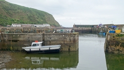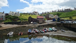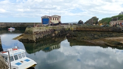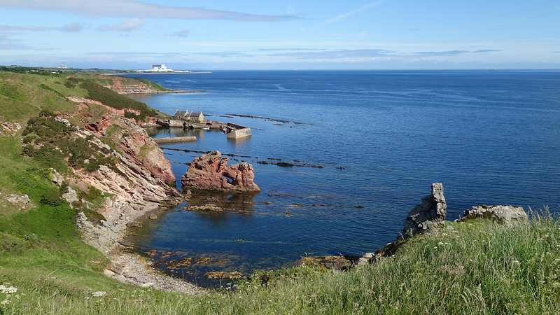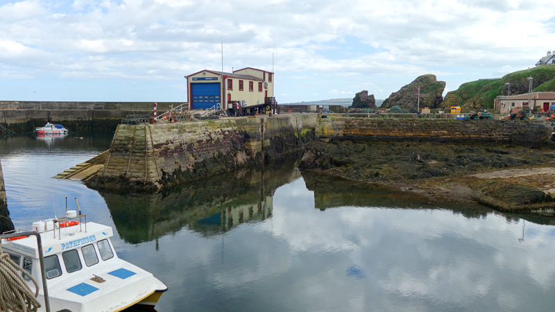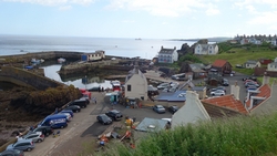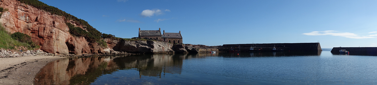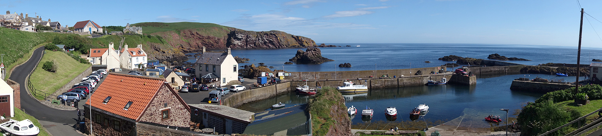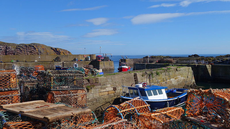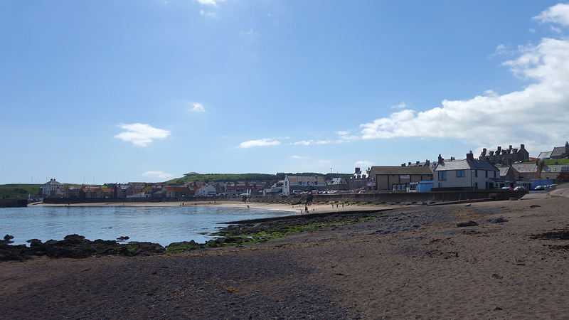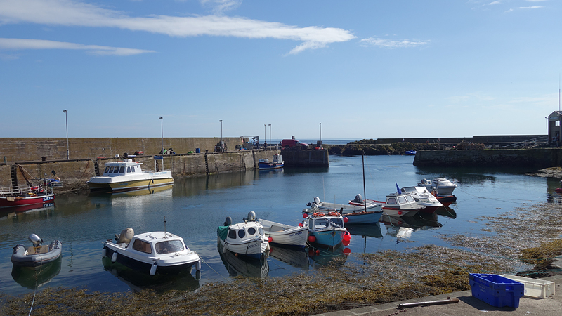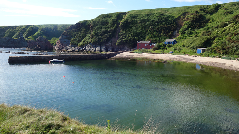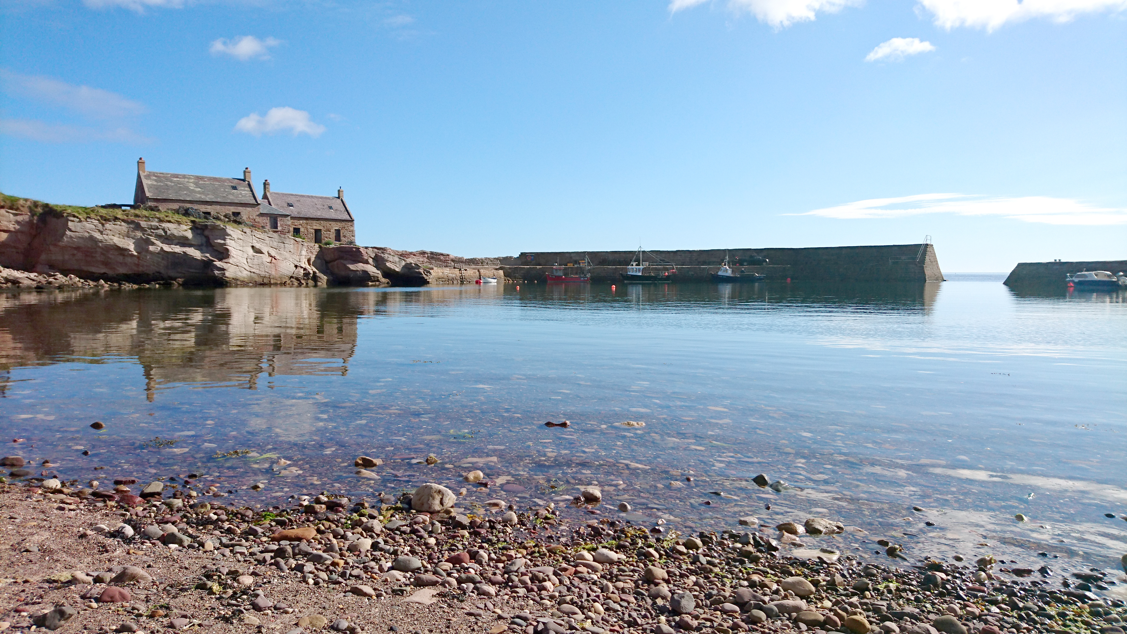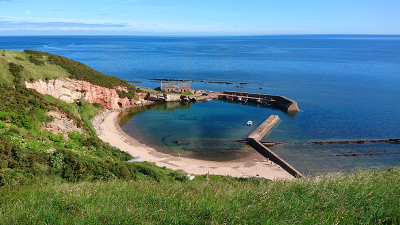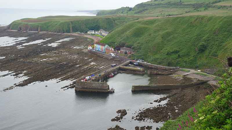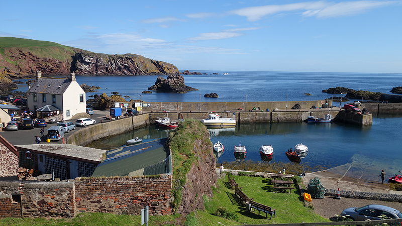 Ik wandel eerst even door het haventje om te kijken en vast wat foto’s te maken. Het is heel pittoresk en heel engels. Geweldig. Als ik langs het café loop, zit de vrouw van de rugzak daar en we raken even aan de praat. Zij wandelt veel en kent de route. Vandaag doet ze iets anders maar ze sliep bij st abbs head. Tsja dat snap ik. Dat had ik ook gewild, lijkt me geweldig.