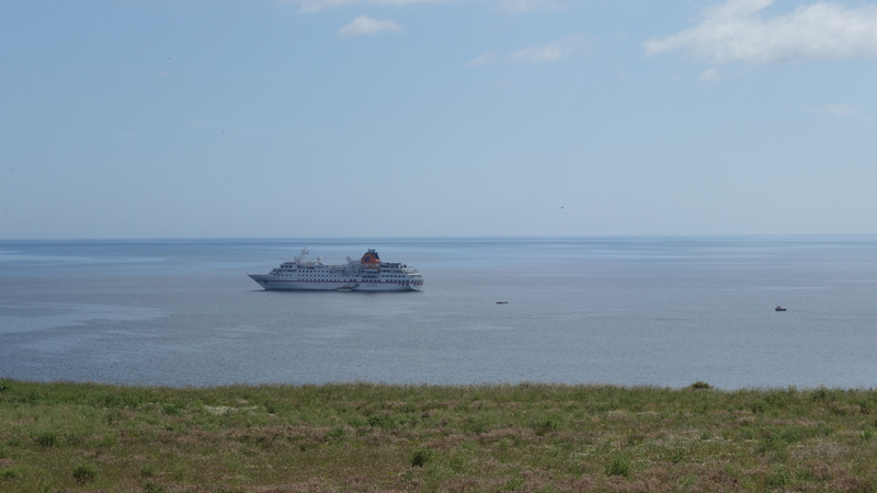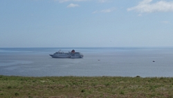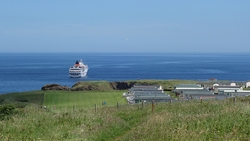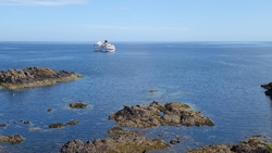 Ik groet een wandelaar en omdat ik denk een Nederlands accent te horen vraag ik waar hij vandaan komt. Hij blijkt uit Duitsland te komen en nog leuker: hij komt van het cruiseschip dat verderop mooi in zee ligt te schitteren. Ik sprak er al over met het echtpaar waar ik eerder mee sprak. Ze hadden dat schip nog nooit gezien. De wandelaar bleek uit Hamburg te komen. Hij had tot 14 uur de tijd en wilde st. abbs nog zien. Hij wist ook dat er een bus tweemaal in het uur reed vanaf st abbs naar Eyemouth. Ik hoop maar dat hij het allemaal gaat halen! We nemen gauw afscheid zodat hij verder kan lopen. Ik ga de andere kant op, naar Eyemouth waar hij nu vandaan komt.