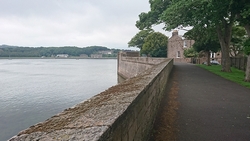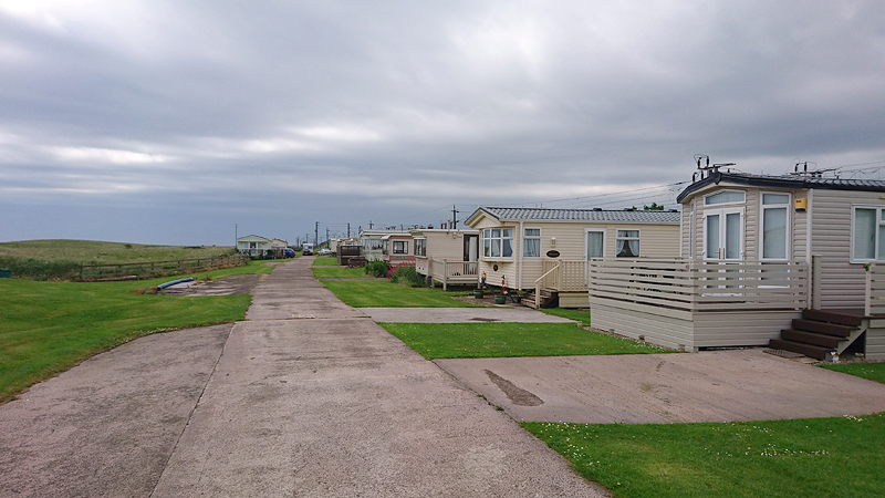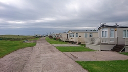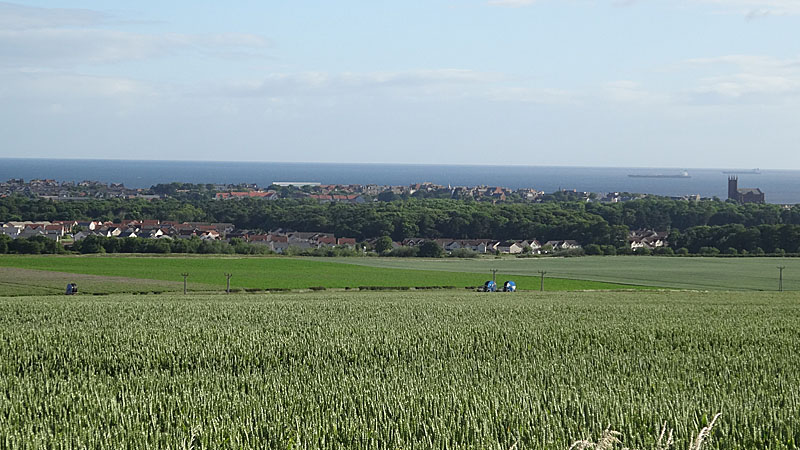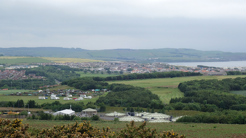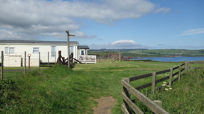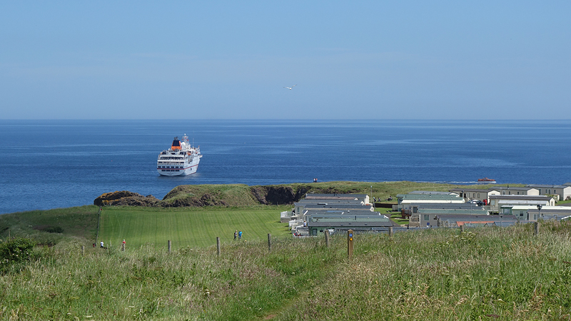 Ik heb steeds beter zicht op het schip. Dat is wel mooi! Ik zie inmiddels ook een caravan park bij Eyemouth. Iets gigantisch zo te zien en daar lopen we eerst omheen voordat we in het centrum aan zullen komen. Het is er vast druk met de mensen van het cruise schip.