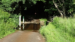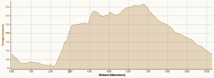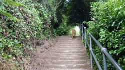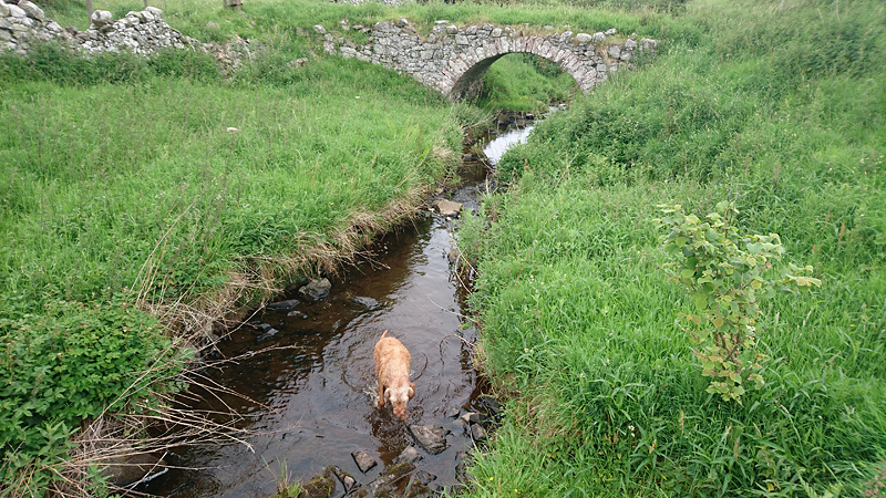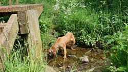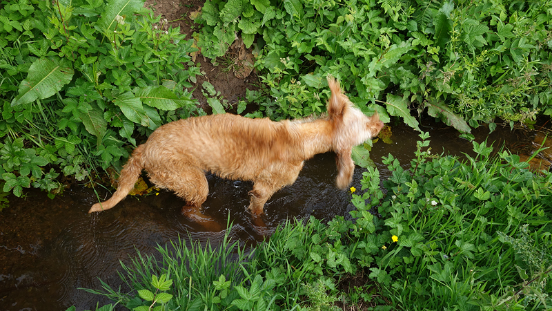 Het lopen gaat prima. Voordat ik er erg in heb, zijn we alweer langs de akker gelopen en steken we het bruggetje weer over waar wafje kan badderen en kan drinken. Ik vul toch maar voor de zekerheid even haar softflaskje met water uit de beek, anders heb ik straks misschien te weinig. Ik zie ook weer het strandje in de diepte liggen waar we nu eerst naartoe gaan. Ik moet nodig plassen en ga maar gewoon midden op het pad zitten. Omdat ik net hoog was, kon ik zien dat er niemand van beide kanten aan kwam…..