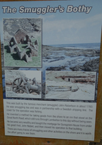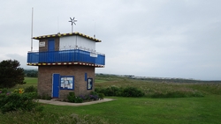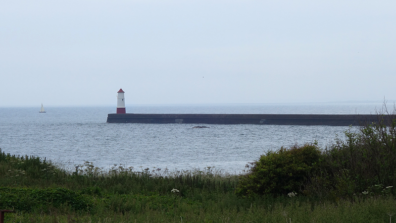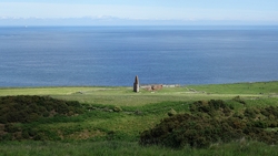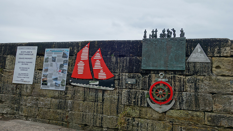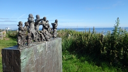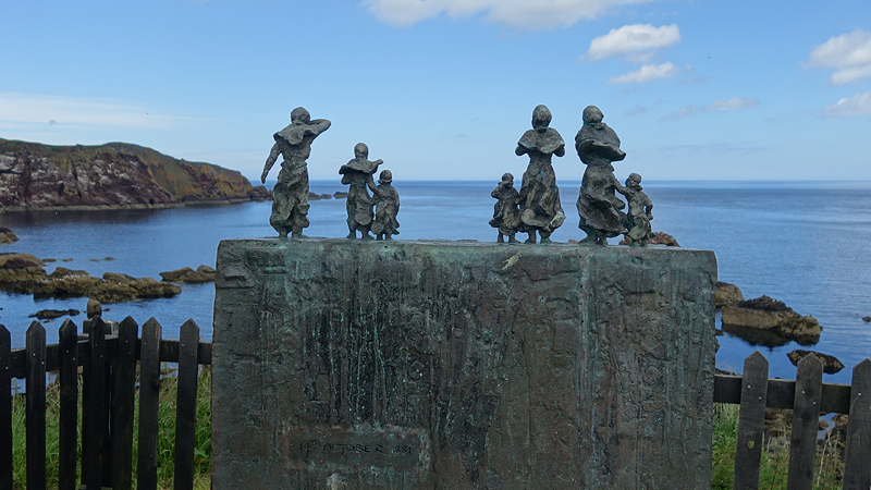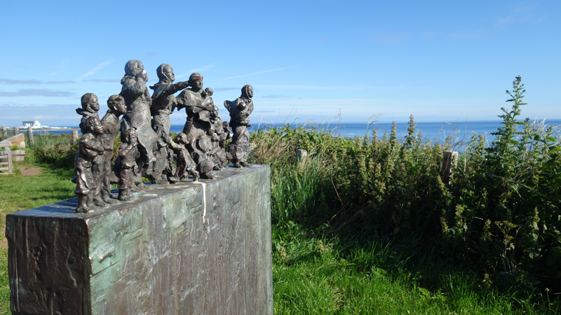 Omdat waf wel happy lijkt en ik ook nog wel kan, lopen we toch maar verder richting St Abbs head. Daarvoor moeten we vervelend genoeg steile trappen beklimmen maar ik zie al dat we op de terugweg gewoon over de weg kunnen lopen. Dat is beter voor woef maar zonder morren klimt die stakker naar boven. Daar zie ik een kunstwerk staan ter nagedachtenis aan de doden van de ramp in 1881. Bij the Cove staat er ook eentje maar met meer mensen, omdat daar meer zeelieden de dood vonden. Wel bijzonder zo. Links het kunstwerk van St Abbs rechts van de Cove (foto van 18.06). Ik geniet van het uitzicht over het drukke haventje met alle mensen. Aparte sfeer daar.