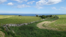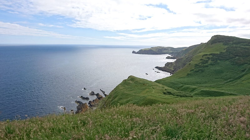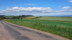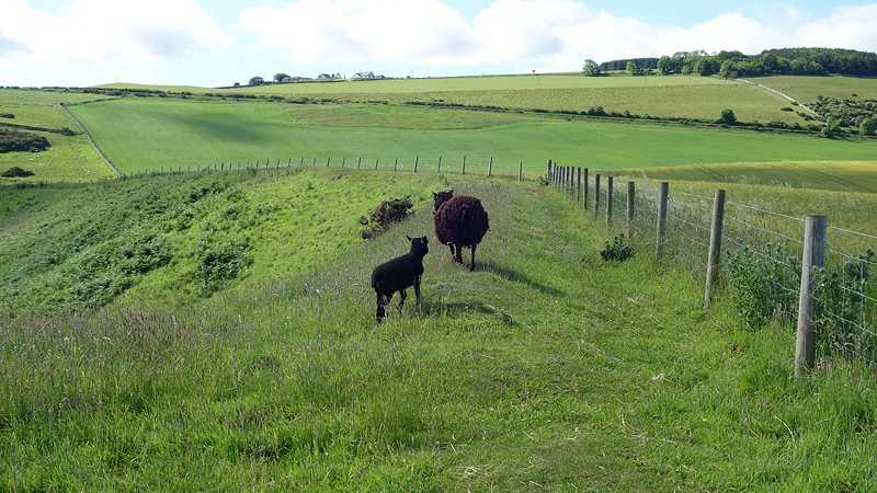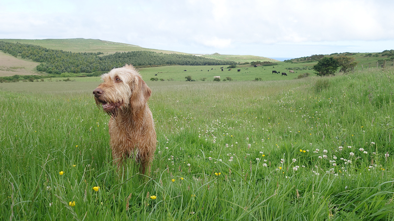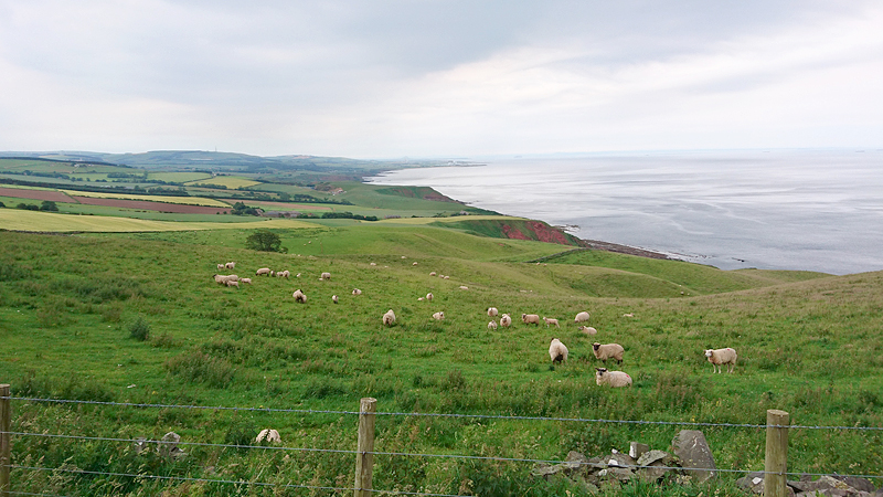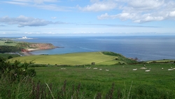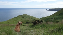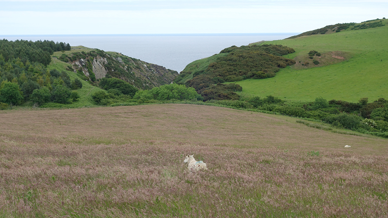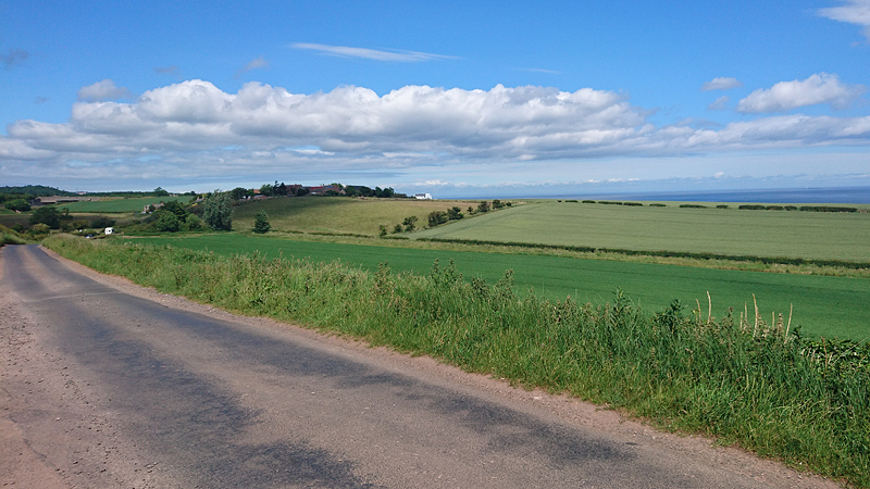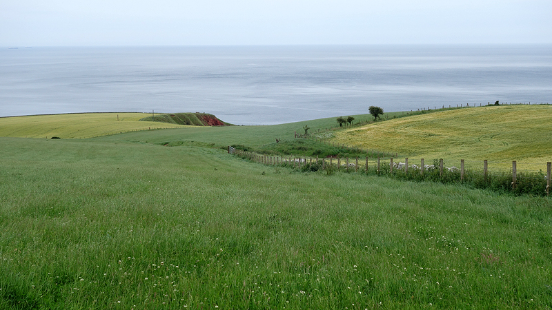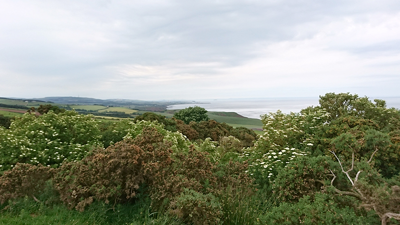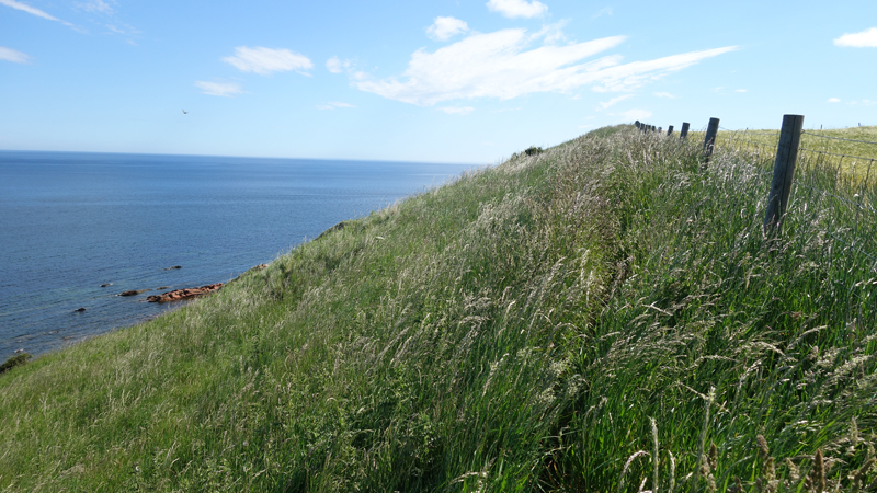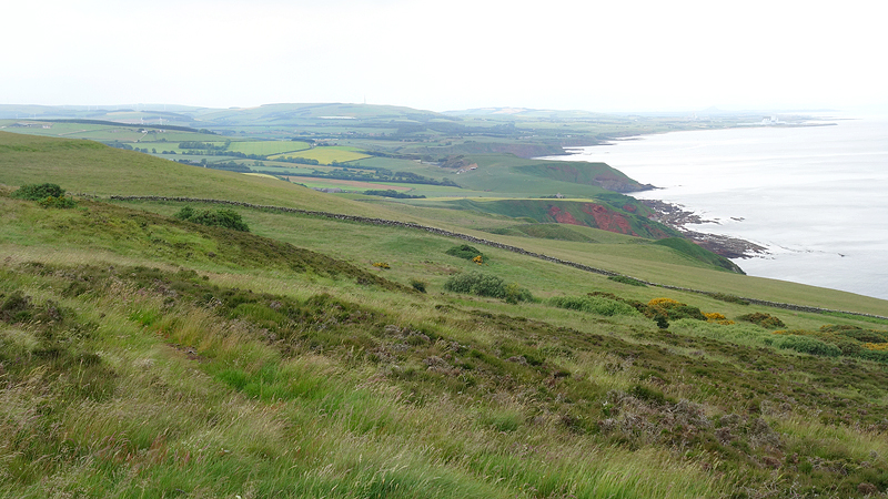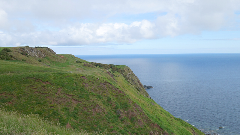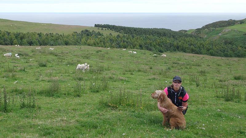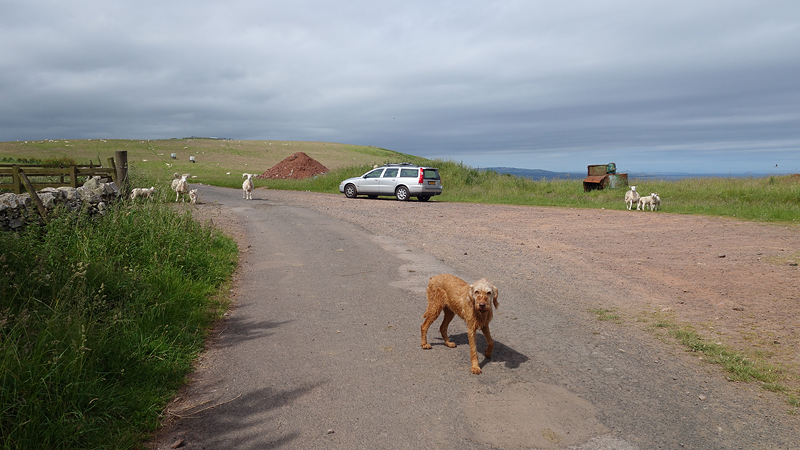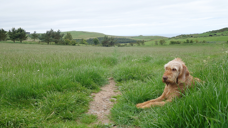 We lopen even langs de weg St Abbs weer uit maar al snel slaan we rechtsaf. Inmiddels is het weer bloed heet. Ik kijk voor me uit en zie een totaal open vlakte met heuvels. Dit lijkt me niet goed voor woef maar ik besluit een klein stukje door te lopen voor een uitzichts punt.