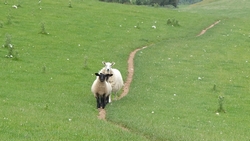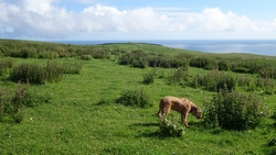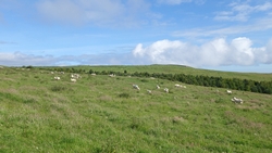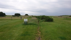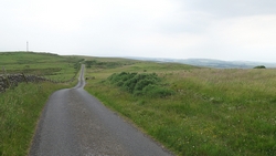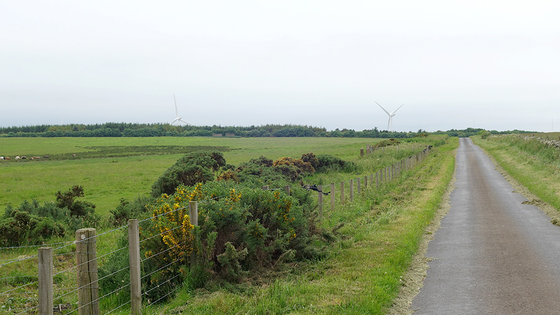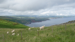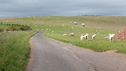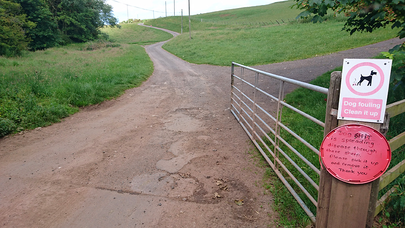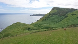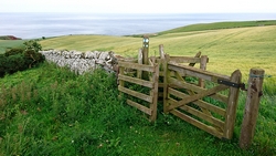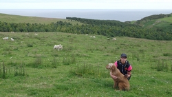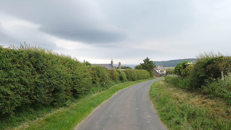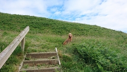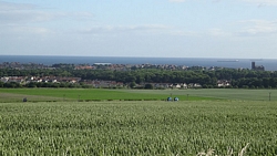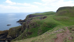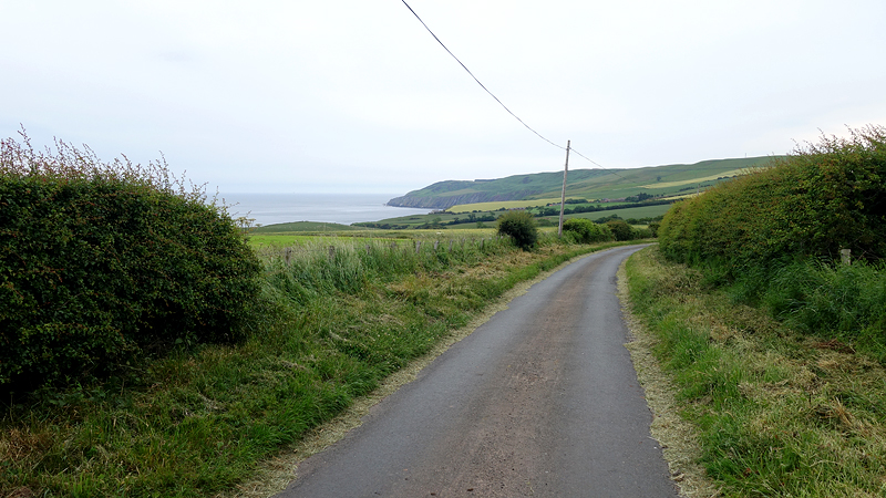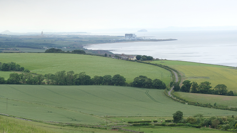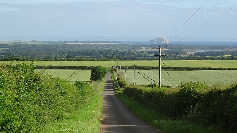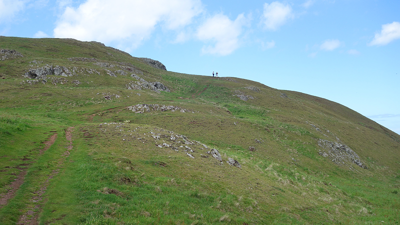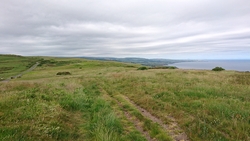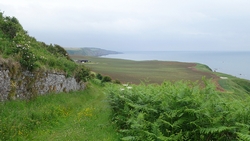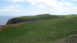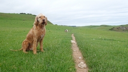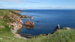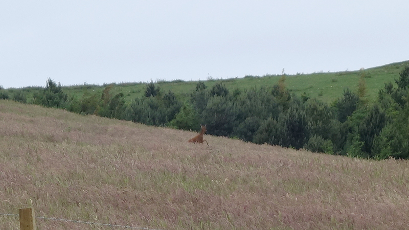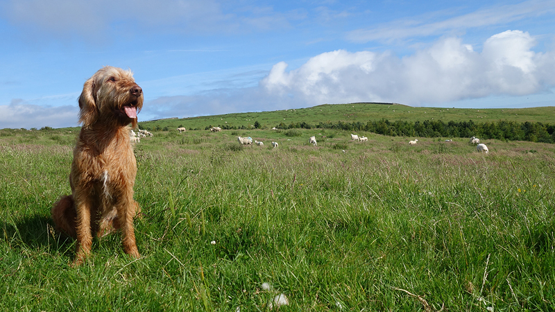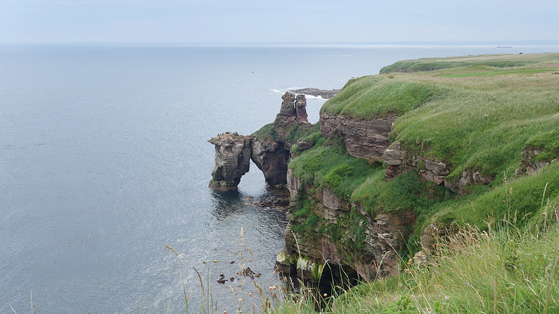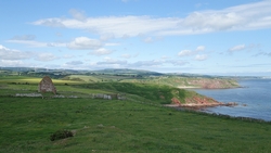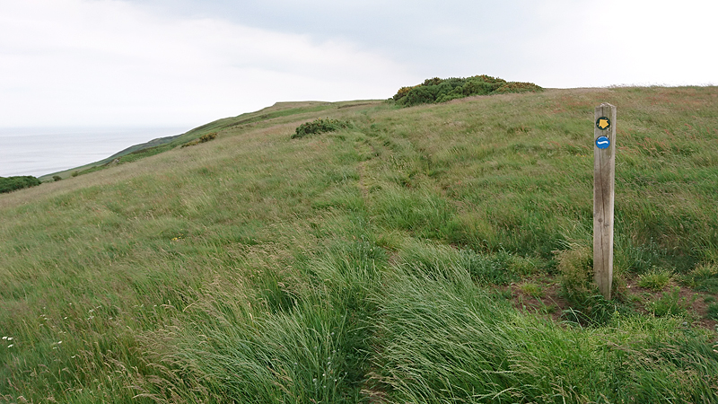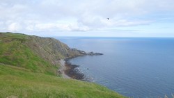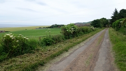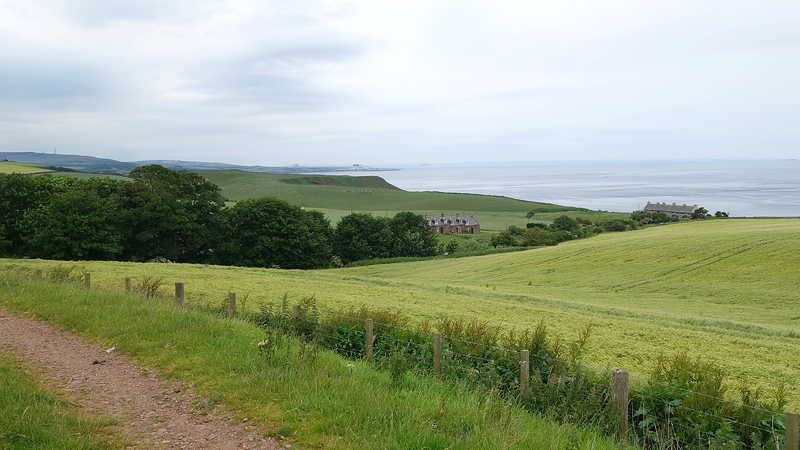 We lopen even langs de weg St Abbs weer uit maar al snel slaan we rechtsaf. Inmiddels is het weer bloed heet. Ik kijk voor me uit en zie een totaal open vlakte met heuvels. Dit lijkt me niet goed voor woef maar ik besluit een klein stukje door te lopen voor een uitzichts punt.