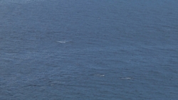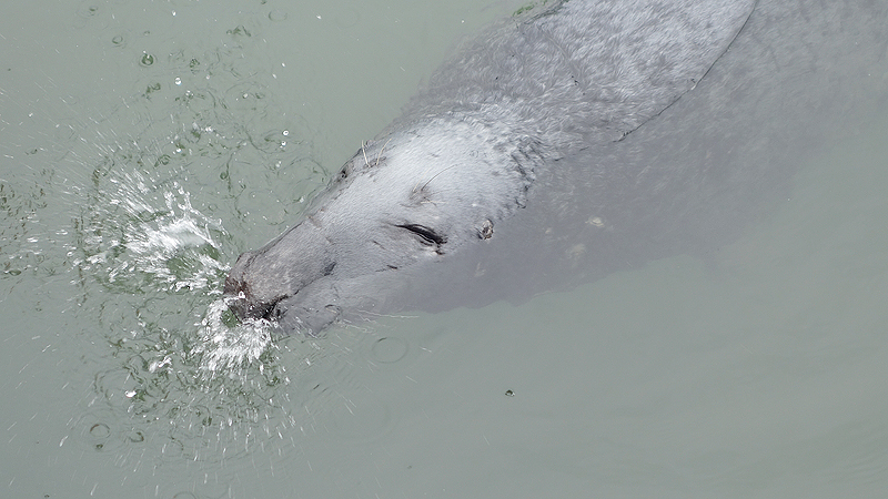 Minuten lang staar ik gefascineerd naar het schouwspel van de dieren. Het is niet 1 maar het zijn 2 groepen. Wat jammer dat ik geen verrekijker bij me heb! Maar het is prima te zien. Ik maak een foto maar ik zie natuurlijk niets terug. Alleen aan het wit is te zien dat daar echt iets ‘zit’ in het water. Geloof me, het waren dolfijnen. Wafje is er maar bij gaan liggen en wacht rustig af wat we gaan doen.