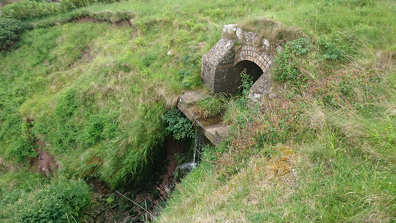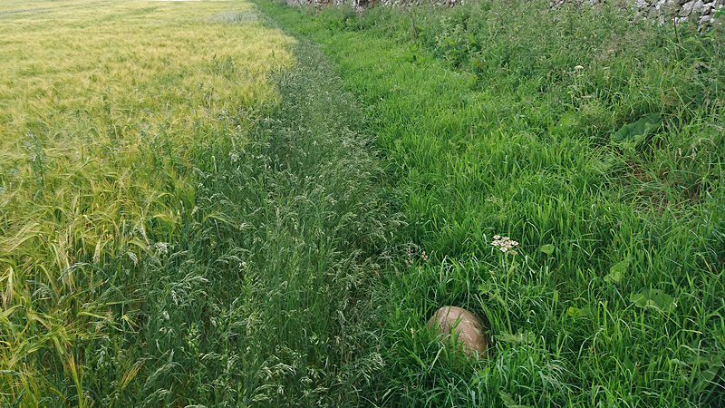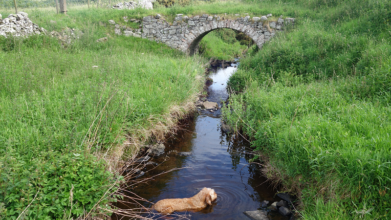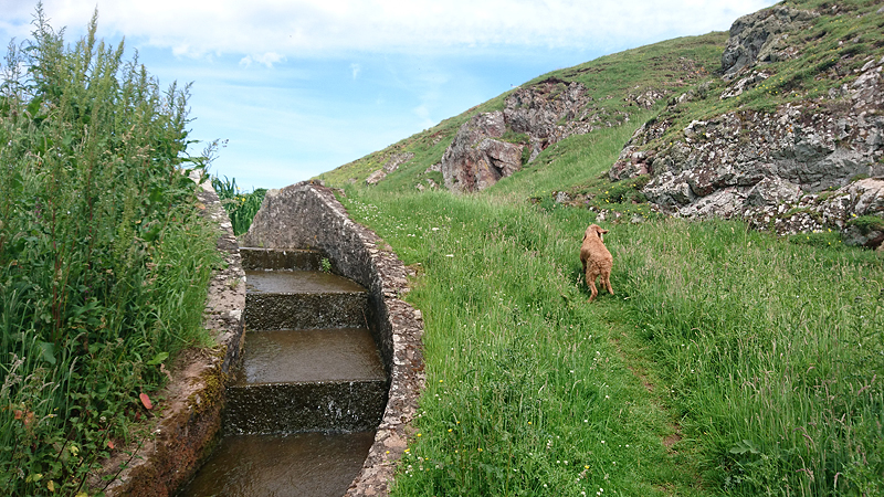 Even verderop loopt water onder een bruggetje. Hier wil madam wel even drinken en dat mag natuurlijk. Drinken en badderen. Het kan niet op…. Goed te weten dat het hier kan trouwens, want zo komen we zeker van begin tot eindpunt vandaag ondanks de warmte. Ik vrees alleen dat dit het laatste punt zal zijn waar badderen en drinken kan tot Eyemouth. We lopen verder en het pad verandert langzaam in een smal pad langs een akker. Niet meer een mooi pad maar ik kan hier nog wel rustig door hobbelen. Warm is het hier wel en ik besprenkel wafje een paar keer met wat water. Zo gaat het water wel snel op natuurlijk. Ik zie in de verte een cruise schip schitteren in de zon. Jammer genoeg heb ik tegenlicht dus een foto lukt niet echt.