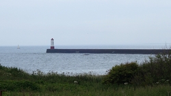Ik kijk even aan de andere kant maar besluit bij de parkeerplaats echt oom te keren. Het is wel genoeg voor vandaag en dit is een mooi punt om vanaf de andere kant te gaan bereiken bij stage 2 van de route. Als ik sta te mijmeren en over het water uit kijk, zie ik een bootje varen. Wat zie ik nou achter dat bootje? In het water? Met van die witte golfjes eromheen? Zijn dat nou dolfijnen? Ik kijk en tuur. Dat zijn toch echt dolfijnen en nog een hele groep ook. Ze springen boven het water uit en lijken met het bootje te spelen en het te volgen. De boot verdwijnt achter de gebouwen rond de vuurtoren en ik ga gauw naar de andere kant. Daar is het bootje weer en de dolfijnen ook. Ik loop naar de kant. Wat geweldig. Voor het muurtje van de vuurtoren zitten mensen met verrekijkers naar de rondvliegende vogels te kijken. Ik voel me een beetje lullig maar ik vraag of ze misschien ook de dolfijnen zo kunnen zien? Direct staat iedereen op en na even zoeken in het water en wijzen, heeft iedereen de groep in de gaten.