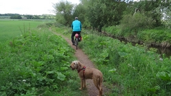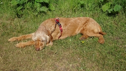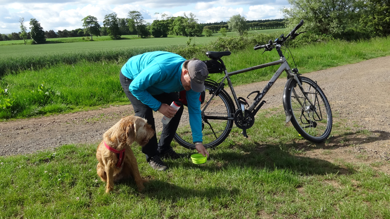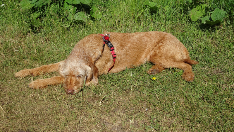 Tegen het einde lijkt ze echter weer wat vrolijker en we geven eerst wat water en besluiten nog een stukje verder te lopen met haar. Een stukje verder besluiten we haar een paar brokjes te geven. Misschien heeft ze een lege maag ofzoiets en hoewel honden niet met een volle maag mogen lopen, lijken een paar brokjes wel OK te zijn. Ze is daarna ook meteen weer vrolijker. We besluiten heel rustig door te sukkelen en bij de Ford dan even te rusten op het bankje. Dan kan ze even uitbuiken en daarna kunnen we weer verder.
