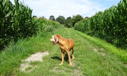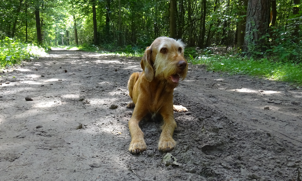 Dat is eventjes heel warm omdat het helemaal open is. Eerst door het maisveld en daarna over de weg. Woef moet over het gras omdat het asfalt ook erg warm is maar in no time zijn we alweer in de schaduw van het bos en lopen we over de snelweg en de spoorweg.