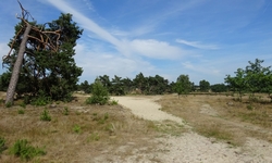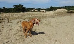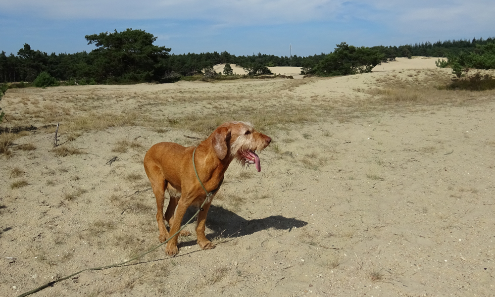 Daarna slaan we linksaf richting de zandverstuiving. De vorige keer was dit gebied ons doel en liepen we dus veel verder het gebied in, nu blijft ik vanwege de tijd dicht langs de weg lopen zodat ik straks op tijd terug ben. Op het zand is het net de sahara. Het is heel heet, en het zand is ook erg warm. In de schaduw blijf ik even staan om woef weer water te geven en even te laten uitpuffen maar ze doet het prima.