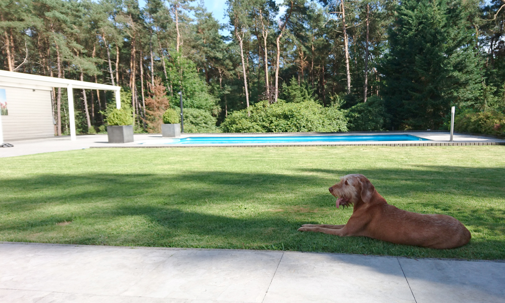 Dat is eventjes heel warm omdat het helemaal open is. Eerst door het maisveld en daarna over de weg. Woef moet over het gras omdat het asfalt ook erg warm is maar in no time zijn we alweer in de schaduw van het bos en lopen we over de snelweg en de spoorweg.