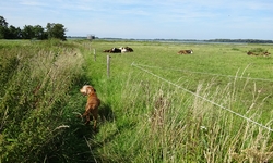Vandaag heb ik eerst een taxateur over de vloer die daarna allerlei dingen van me wil ontvangen. Dat ga ik dus eerst opzoeken, scannen en mailen. De hele ochtend is dus alweer voorbij voordat ik erg in heb. Ik ben zo moe dat ik helemaal geen puf meer heb om richting Hulshorst te rijden en ga in de tuin zitten. Maar dat bevalt me ook niet en daarom besluit ik alsnog maar te vertrekken en me zelfs om te kleden voor een rondje. Lopend gaat alles immers sneller dan wandelend en ik wil eigenlijk kijken of ik de vogelkijkhut kan vinden in de buurt daar. Zo vertrek ik dus alsnog redelijk laat en parkeer in het gras bij de doodlopende weg waar we vorige week hebben staan kijken met de auto. Ik kom meteen iemand tegen die ook met de hond aan het hardlopen is en we raken aan de praat. Ik vraag waar zij loopt, of de honden los mogen lopen en waar ze kunnen zwemmen. Het is vandaag ook ineens weer erg warm dus wafje wil straks vast even afkoelen zeker na de warme autorit.