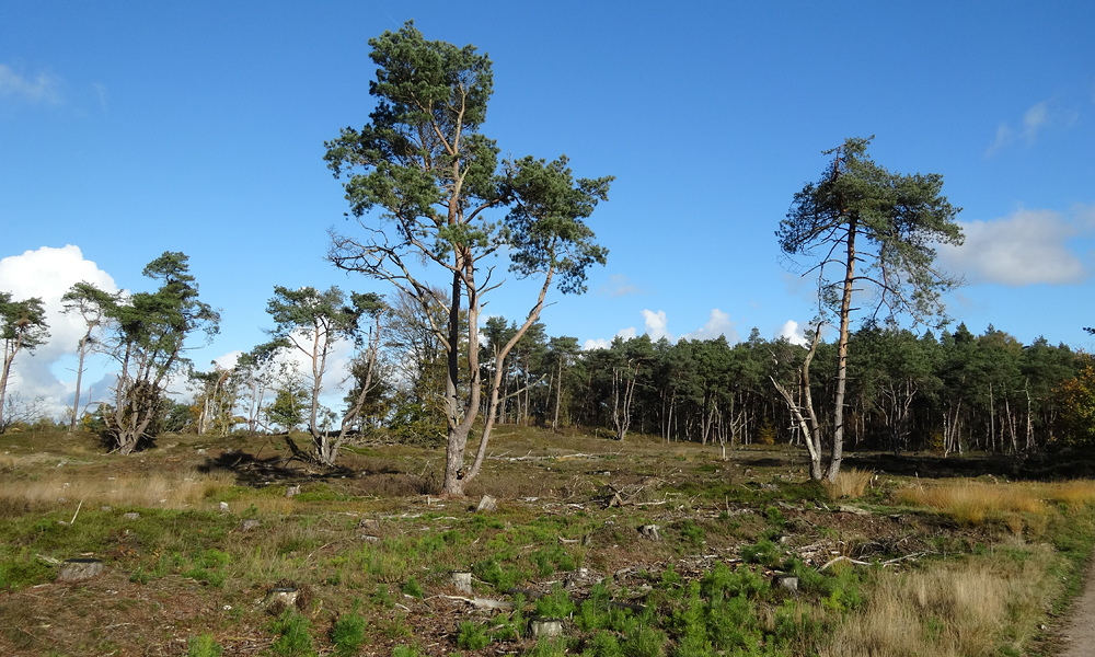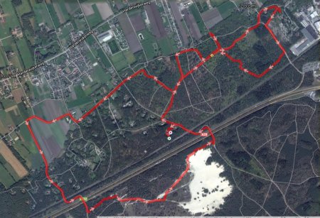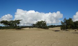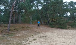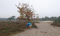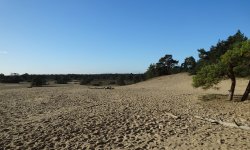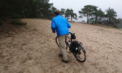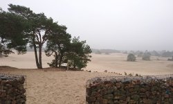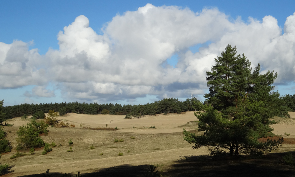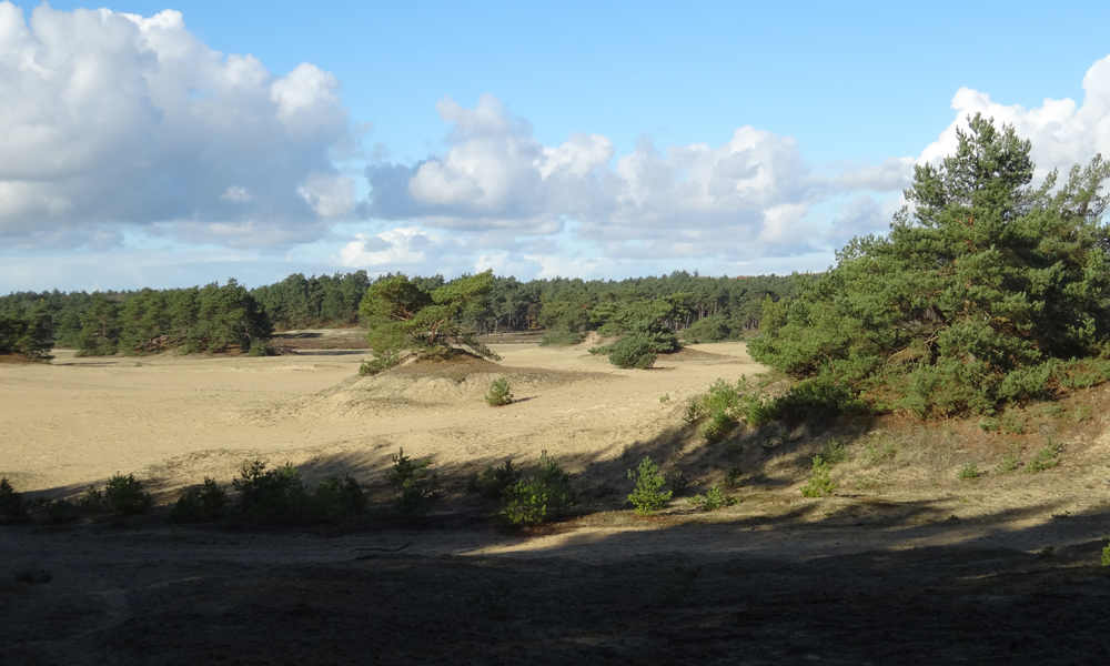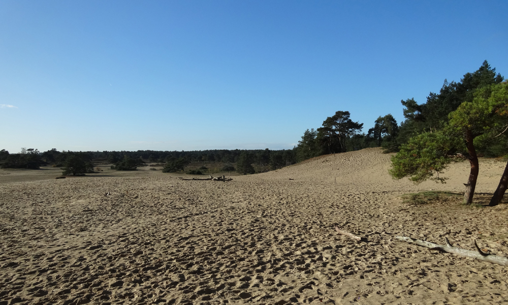 Nadat we een poosje kriskras door het bos gelopen hebben, komen we weer uit bij het spoor en daar steken we de weg over om naar de zandverstuiving te gaan waar ik ook wat foto’s maak.