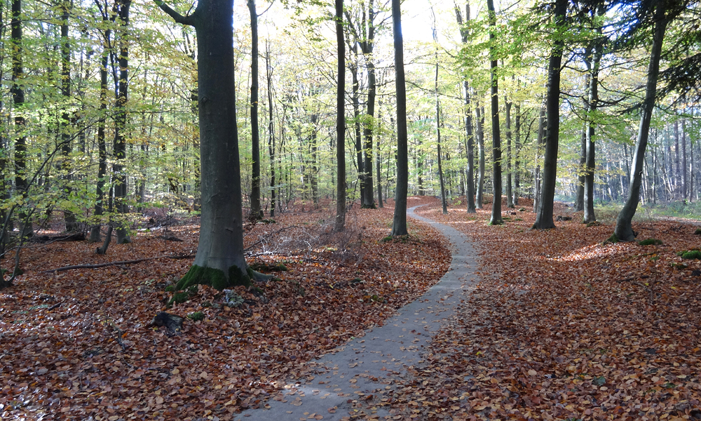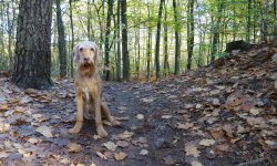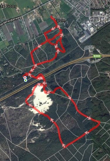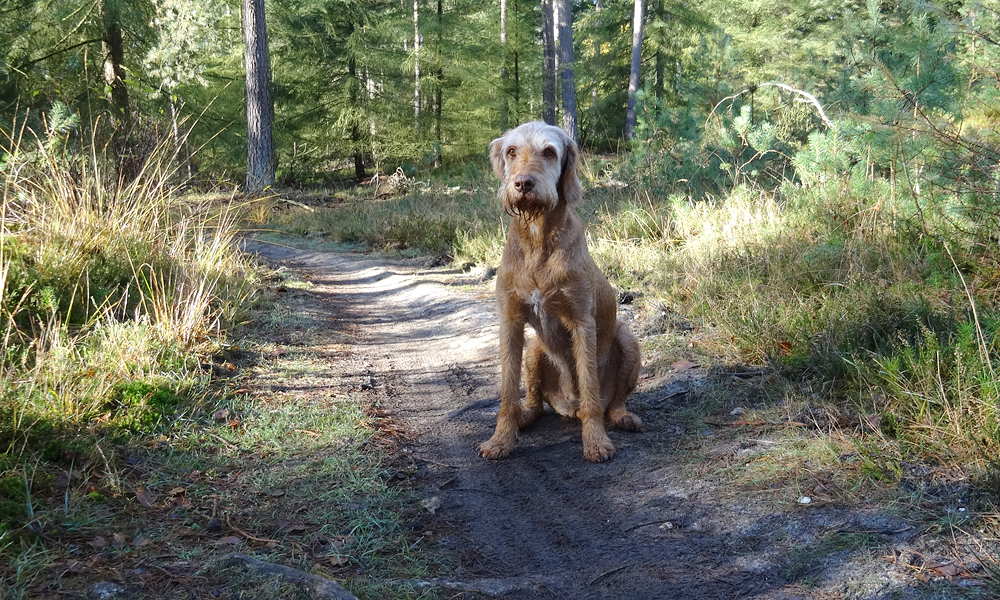 Als we het hek uit zijn, starten we eerst even in het bos tegenover het huis. Hier mag woef lekker los dus dat is fijn voor haar.