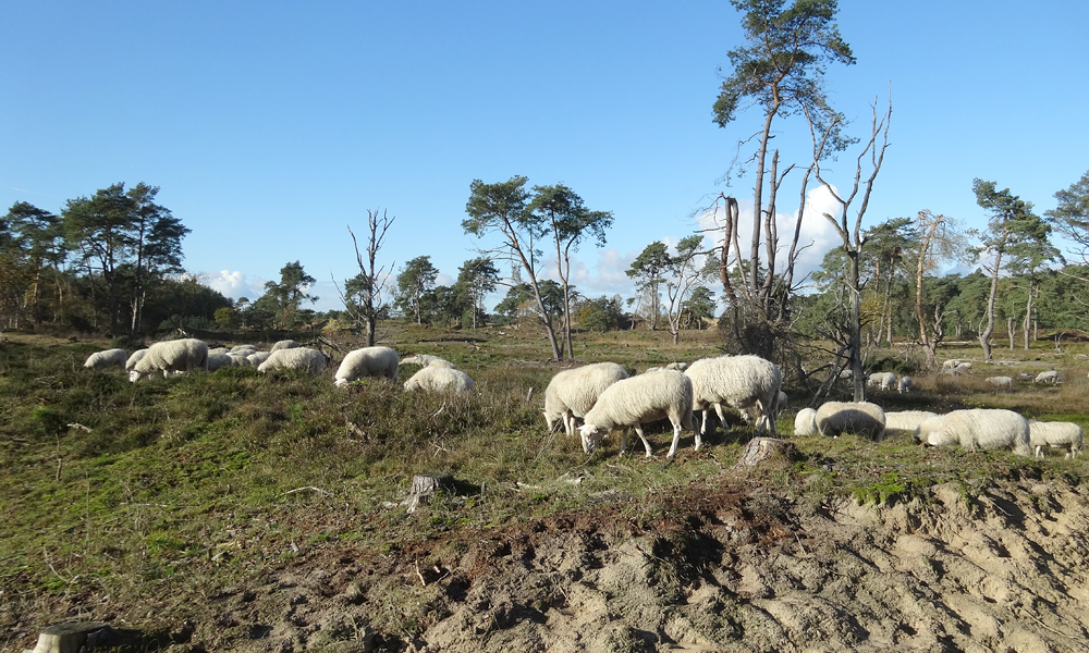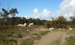 Daarna verkennen we gewoon een pad en lopen maar op goed geluk door. Ik blijk weer op een stuk zandverstuiving te komen maar kom ook over een prachtig stuk heide waar toevallig net een schaapskudde loopt. Dat is natuurlijk wel heel leuk. Ik heb woef even snel aan de riem gedaan en zwaai naar de herder in de verte. Die moet ik een keertje spreken over de schapen.
