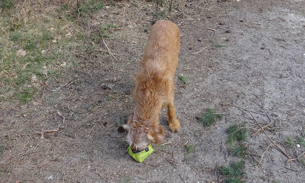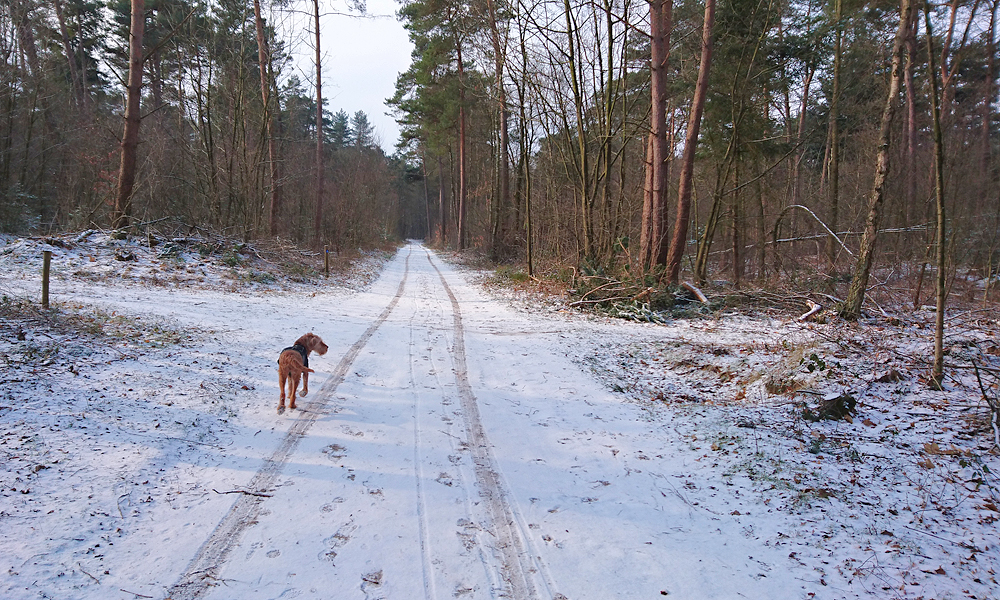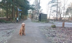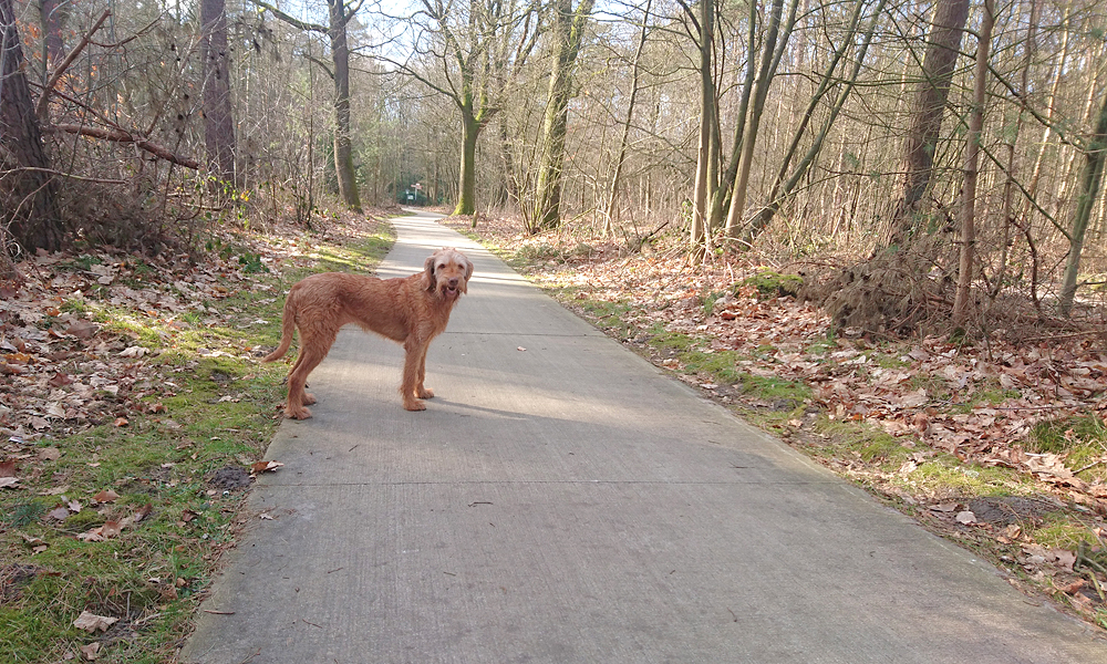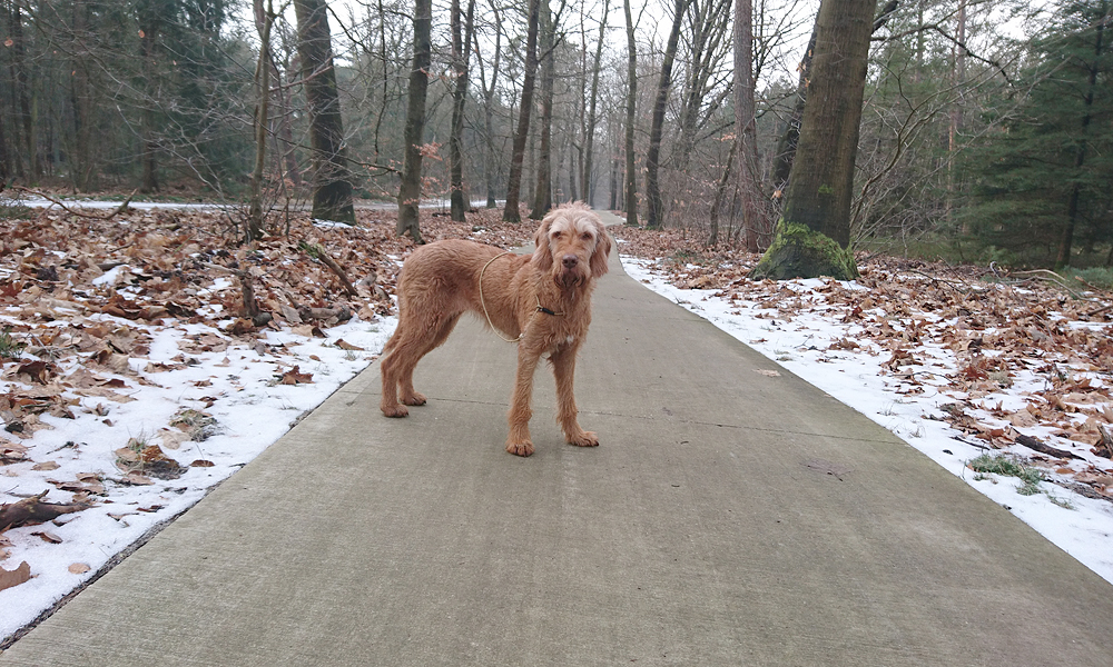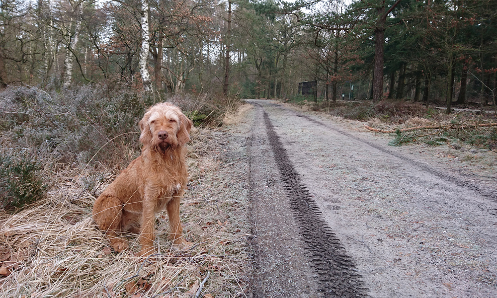 Het is prachtig zonnig weer ook al is de temperatuur vrij laag en onder nul. We hobbelen rustig door het bos aan de overkant en lopen verder richting de rotonde bij Nunspeet. Daarna gaan we over het fietspad richting de Zandenplas. Ik had ook aan de overkant verder kunnen lopen en daar al door het Zandenbos kunnen lopen. Misschien doe ik dat de volgende keer. Nu lopen we rustig verder. Vlakbij de Zandenplas geef ik woefje wat water omdat ze niet naar de plas mag rennen voor een slokje terwijl ze het hier wel kent. Ze kijkt me aanvankelijk zielig aan. Ik mag toch straks naar de plas voor een slokje?? Uiteindelijk neemt ze dan toch maar een slokje uit het bakje en gaat geduldig weer verder met me mee.