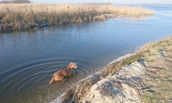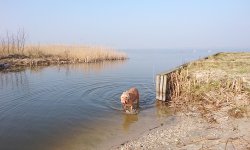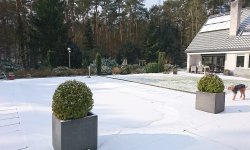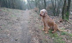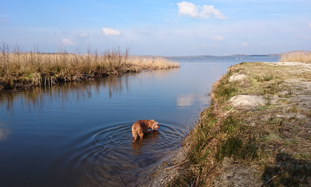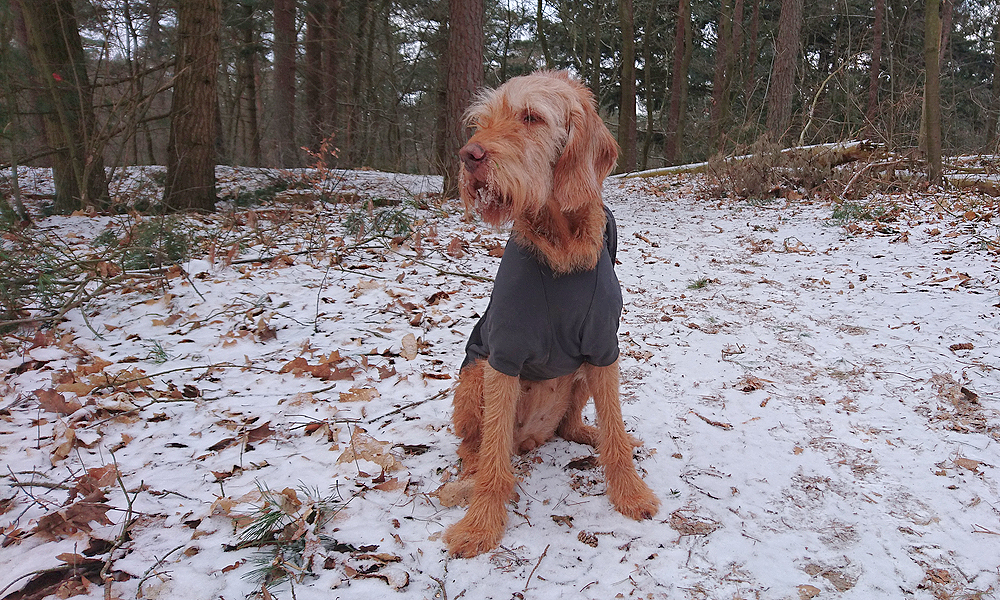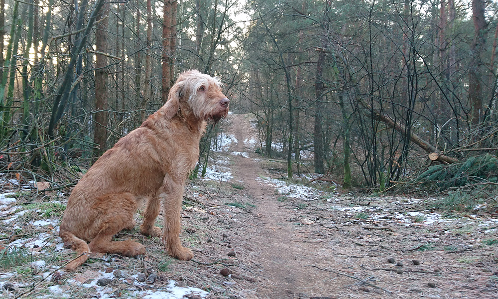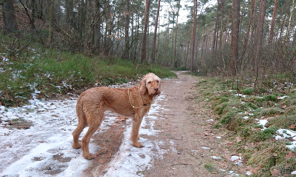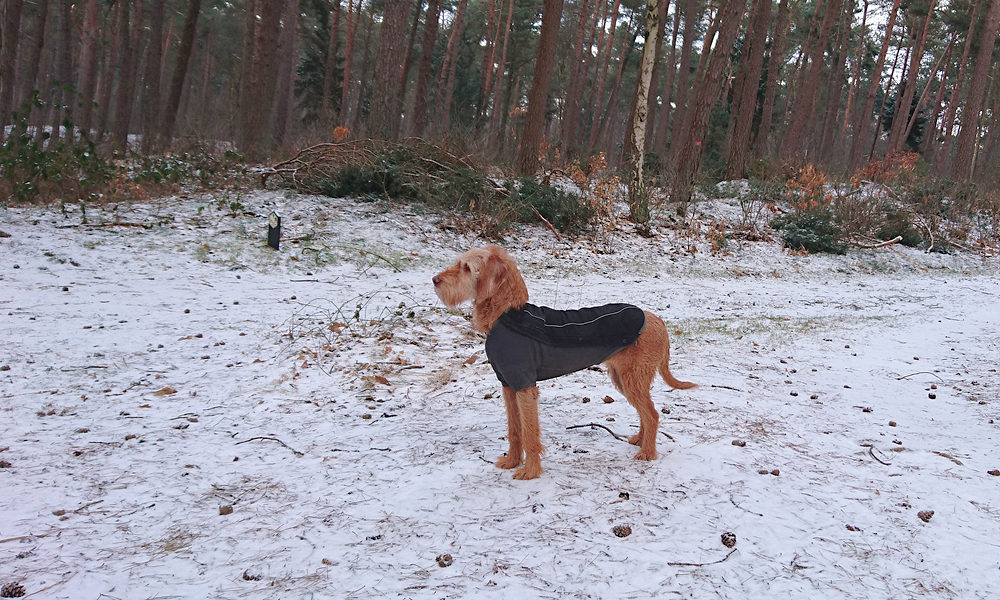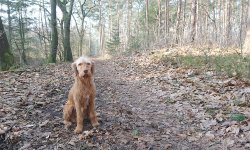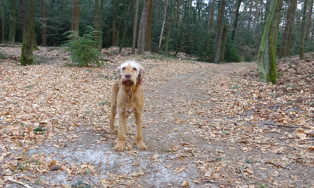 Het is prachtig zonnig weer ook al is de temperatuur vrij laag en onder nul. We hobbelen rustig door het bos aan de overkant en lopen verder richting de rotonde bij Nunspeet. Daarna gaan we over het fietspad richting de Zandenplas. Ik had ook aan de overkant verder kunnen lopen en daar al door het Zandenbos kunnen lopen. Misschien doe ik dat de volgende keer. Nu lopen we rustig verder. Vlakbij de Zandenplas geef ik woefje wat water omdat ze niet naar de plas mag rennen voor een slokje terwijl ze het hier wel kent. Ze kijkt me aanvankelijk zielig aan. Ik mag toch straks naar de plas voor een slokje?? Uiteindelijk neemt ze dan toch maar een slokje uit het bakje en gaat geduldig weer verder met me mee.