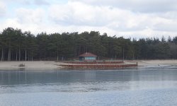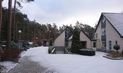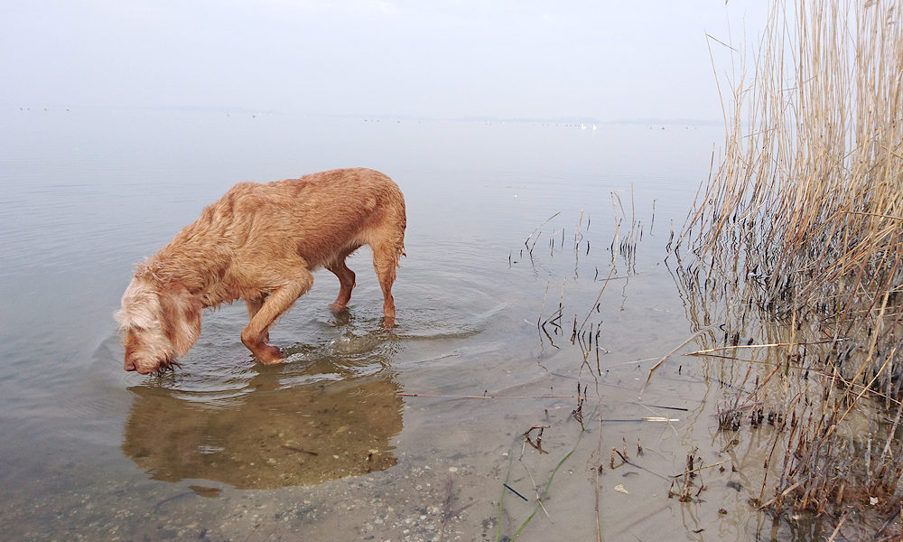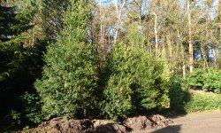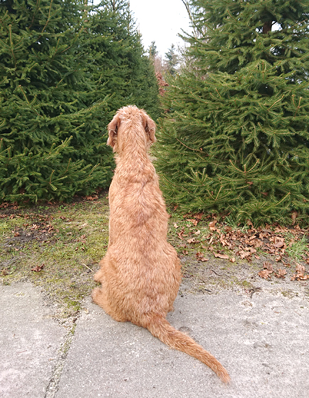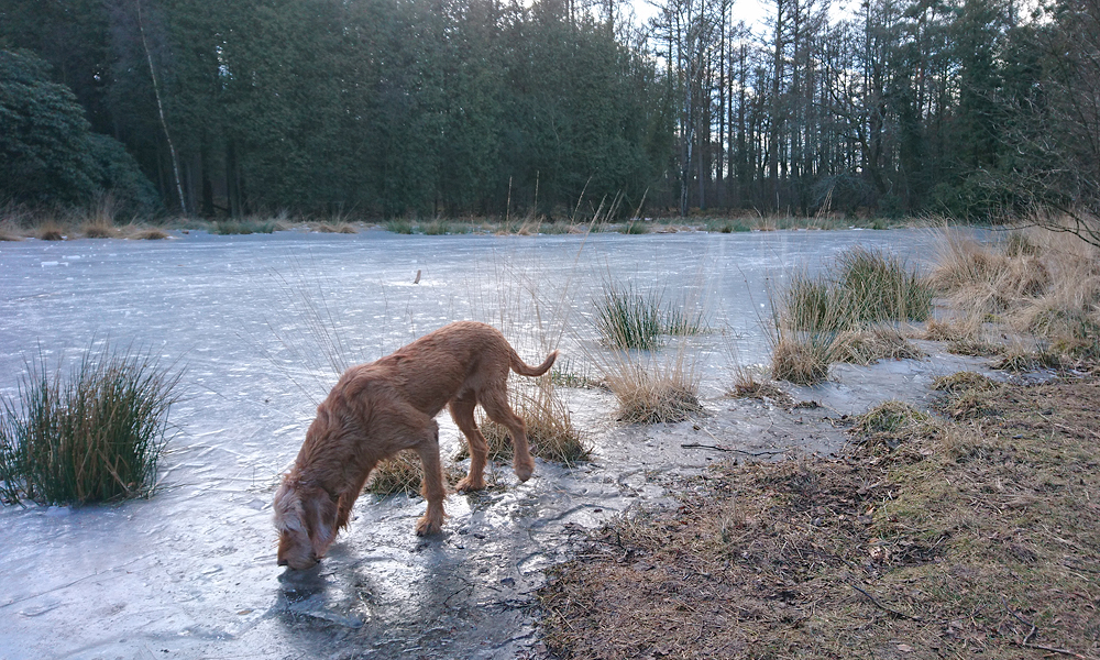 Het is heel stil rond de grote vijver. Er ligt nu ijs op het water maar het moet hier prachtig zijn in de zomer. Overal staan Rhodondendrons en dat zal straks prachtig zijn als ze in bloei staan. Hier moet ik dus eens terug komen. Woef gaat er eens rustig bij zitten en snuift wat in de lucht.
