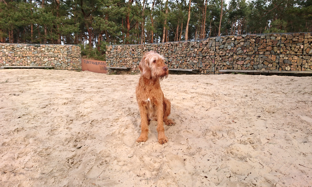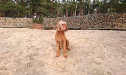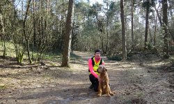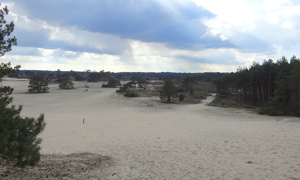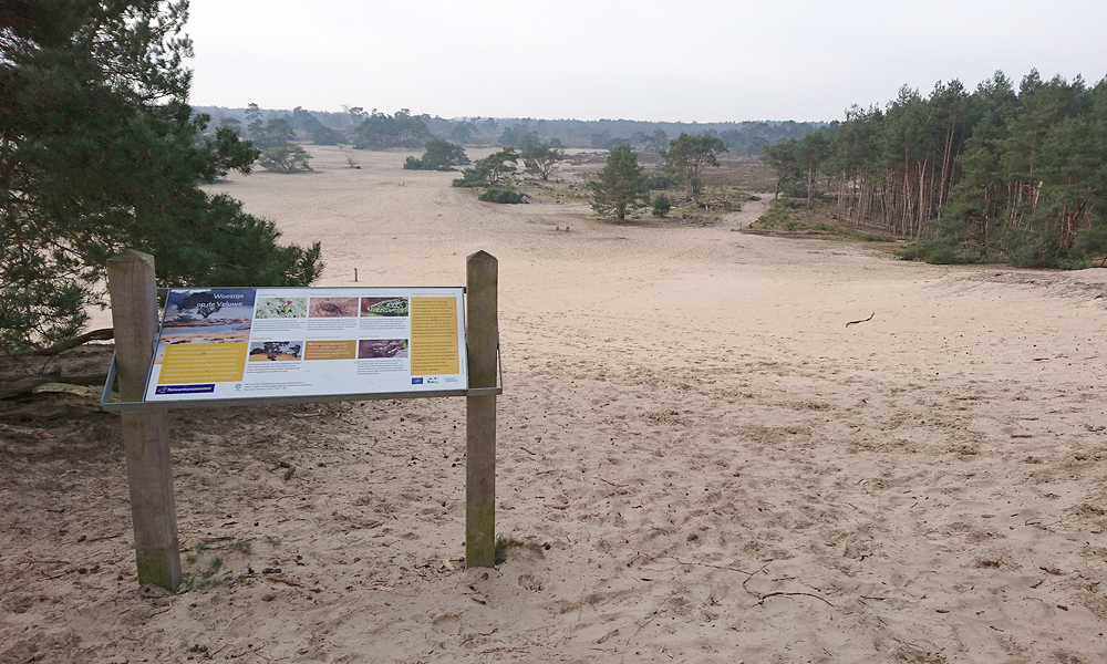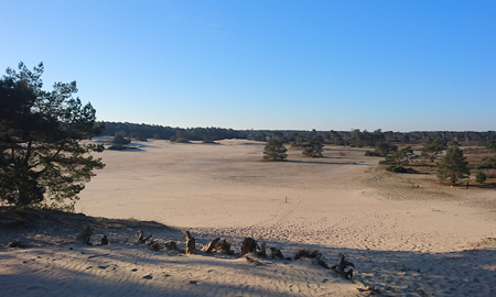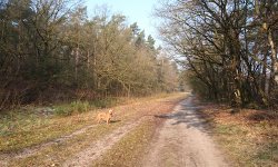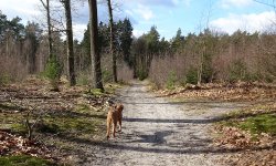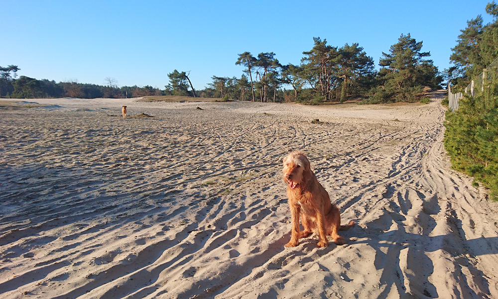 Ik loop langs camping de Tol en steek de drukkere weg over en loop het bos weer in. Vanaf hier herken ik het weer en ik besluit via het fietspad terug te lopen nu. Ik vermoed dat ik nog 5 kilometer onderweg ben dus het wordt best een aardig stukje vandaag. Even verderop het fietspad geef ik woefje weer wat water en dat wil ze wel. Ondertussen rijdt de boswachter langs maar woef is netjes aan de riem nu (hoewel die los op de grond ligt tijdens het drinken) en hij zwaait. Na het drinken hobbelen we rustig door en bij de Brandsweg sla ik rechtsaf. Bij de zandverstuiving ga ik nog even naar boven om te kijken en een foto te maken.