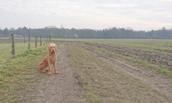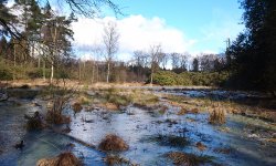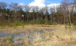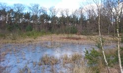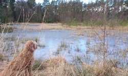 Als ik nog eens op de kaart kijk, zie ik twee blauwe plekjes waar blijkbaar water is. Zou dat het Mosterdveen zijn waar ik nog een keer heen wil? Ik sta net op de kaart te kijken als er een mevrouw met hond aankomt. Ik vraag of zij weet waar het Mosterdveen is maar ze weet het niet ook al loopt ze hier al 30 jaar. We turen samen op de kaart. Of ik misschien het rondehuisvijvertje bedoel? Ik denk het niet maar ik besluit gewoon eerst eens bij die twee watertjes te gaan kijken. Ik hobbel er heen en kom er uiteindelijk inderdaad netjes uit.
