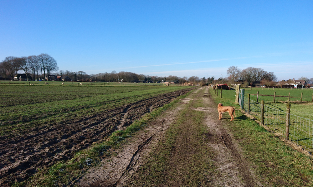 We steken de Harderwijkerweg over en lopen noordwaarts richting het Veluwemeer. Ik kan eventueel linksaf en richting het landgoed maar dat doen we een volgende keer. Ik wil nu de route proberen die ik bedacht heb van te voren en we lopen dus door. Er is hier geen kip en woef loopt in het gras los naast me mee.