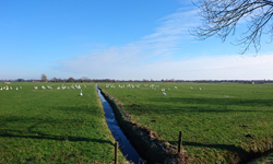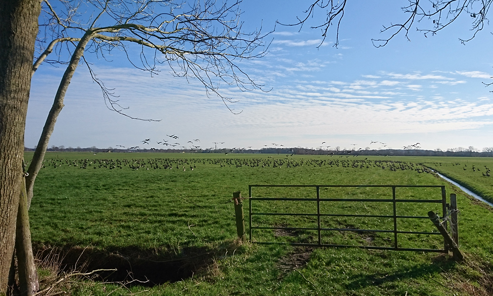 Aan het einde sla ik linksaf richting het vakantiepark en daarna gaan we rechtsaf. Normaal kom ik dus van links maar nu gaan we rechtsaf. Hier veel ganzen in het veld die een enorm kabaal maken. Echt leuk en ik vind het ook heerlijk om zo tussen de weilanden te lopen met schapen en ganzen. Er staan ook zilverreigers in het veld dus dat is ook mooi om te zien.