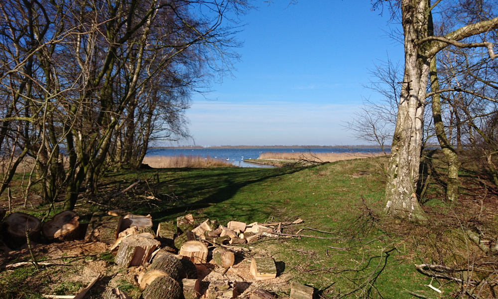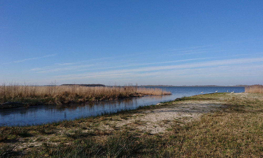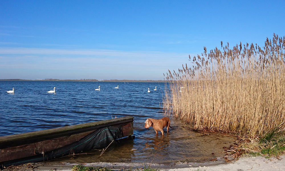 We hobbelen rustig door en als ik weer rechtsaf zou moeten slaan richting de Bredeweg die over zal gaan in de Brandweg sla ik even linksaf. Wat zou daar zijn? Ik zie een verroest bord met ‘verboden toegang’ maar dat is echt onleesbaar. Ik hobbel een klein stukje door en kom dan vlakbij het water. Prachtig! Ik blijf even staan en geniet van het geluid van de zwanen op het water. Er is hier totaal geen wind en geen geluid alleen van het water en de vogels. Een zilverreiger vliegt over. Woef gaat even badderen in het ijskoude water. Brrrrr malle hond. Dat betekent dat ik straks dus door moet lopen zodat ze het niet koud krijgt maar vooruit maar. De zwanen dobberen rustig verder en kijken niet naar woef en woef niet naar de zwanen. Ideaal.