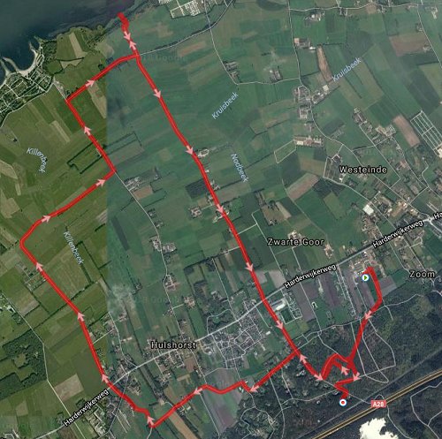 Ik maak een rondje op de computer omdat ik de afstanden nog niet precies weet. Ik zie wel dat ik vanaf huis ook heel makkelijk bij het Veluwemeer kan komen en daarvoor niet hoef te rijden. Dat ontdekte ik vorige week toen ik vanaf het hotel vertrok. Het rondje zal een kilometer of 10 zijn dus dat is prima. We gaan van start en lopen even door het bos zodat woef lekker kan snuffelen. De route gaat weliswaar over de weg maar ik denk dat het afwisselend genoeg is om ook leuk te zijn voor woef en ik kan eindelijk weer eens on road lopen in plaats van alleen maar over zand. Ik loop dus ook op de Bondi zodat ik alles in principe aan kan.