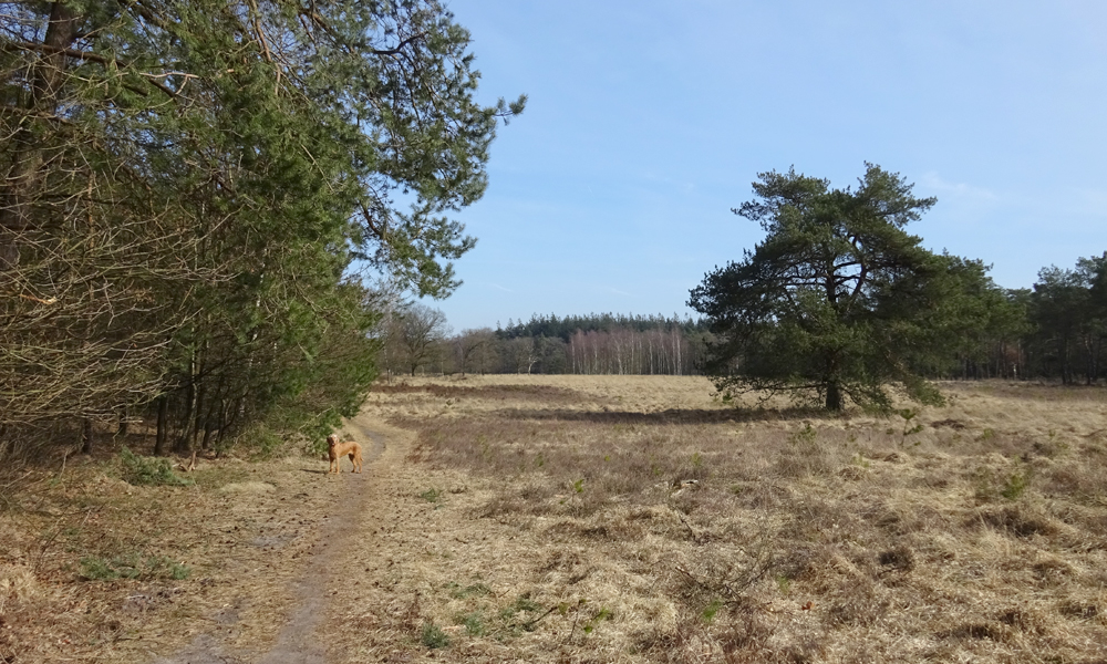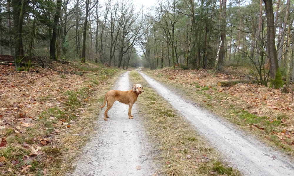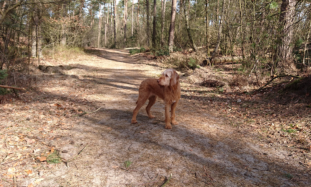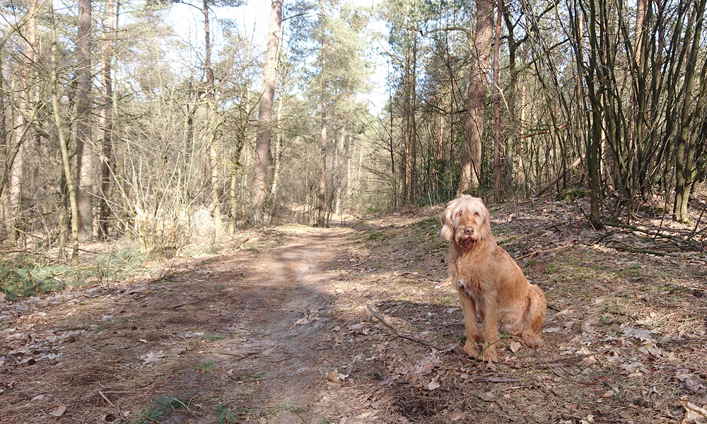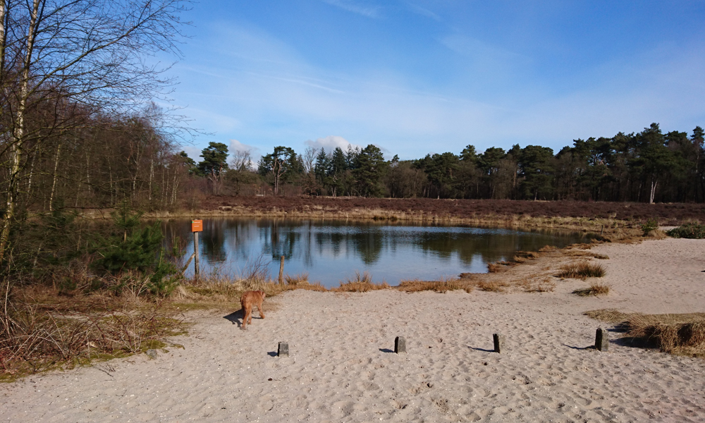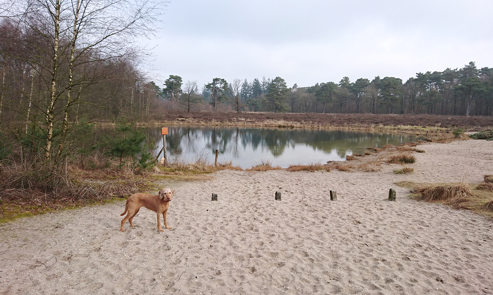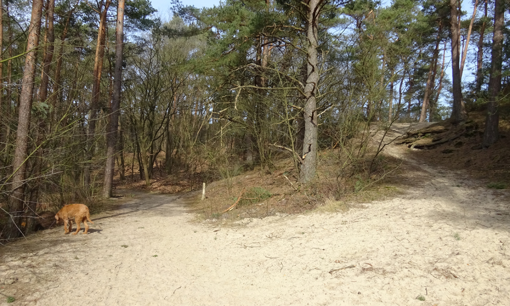 Met ruim 4 kilometer op de teller lopen we het Zandenbos in. Even onthouden dus, want terug vanaf de parkeerplaats is het 3 kilometer. Omdat ik geen water bij me heb nu voor woefje, wil ik naar de Waskolk lopen zodat ze daar even een slokje water kan nemen voordat we weer terug keren. Dat zou dan een rondje van zo’n 16 km worden denk ik.