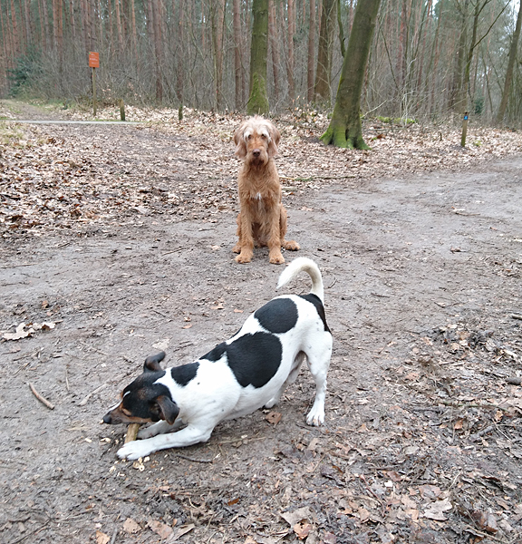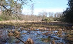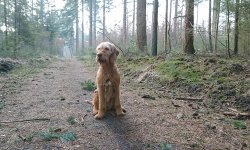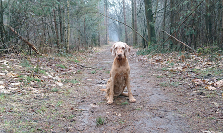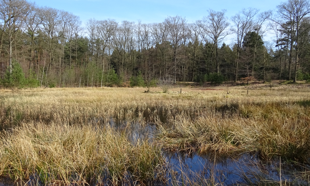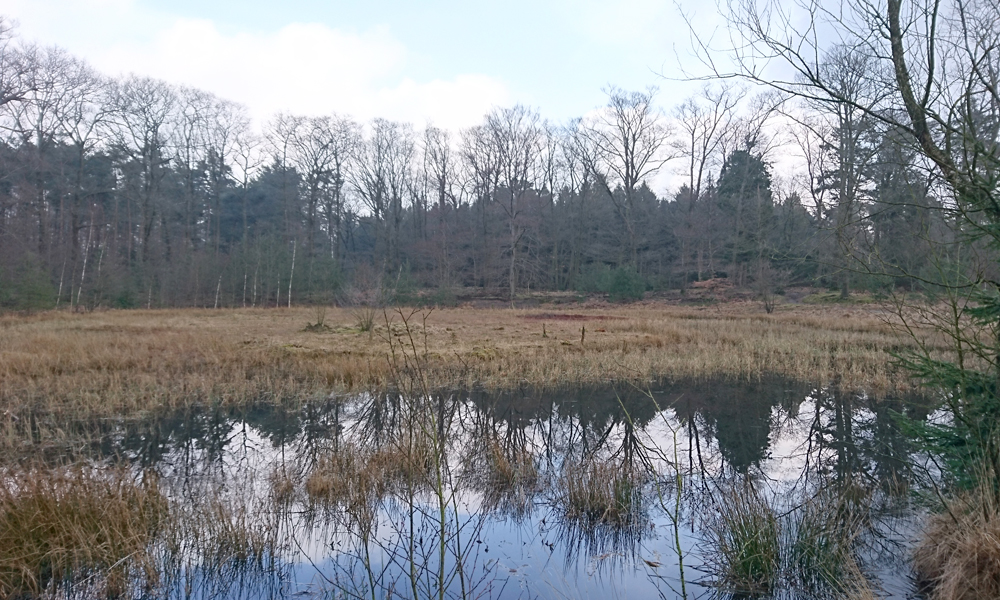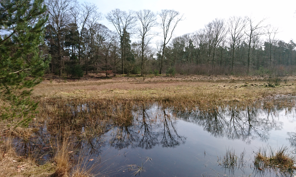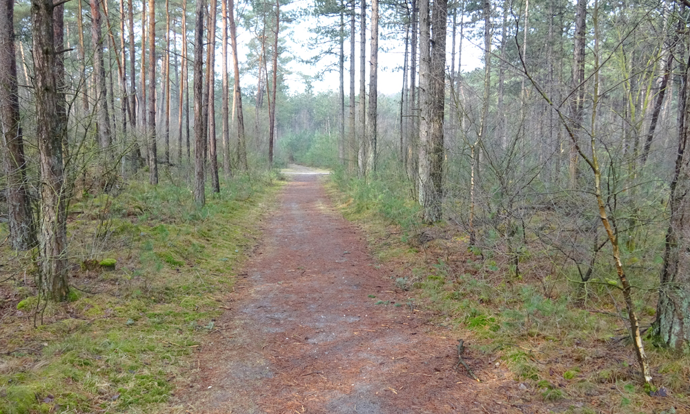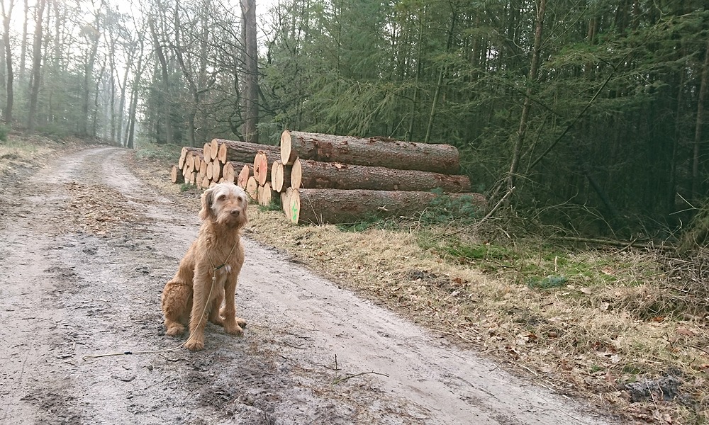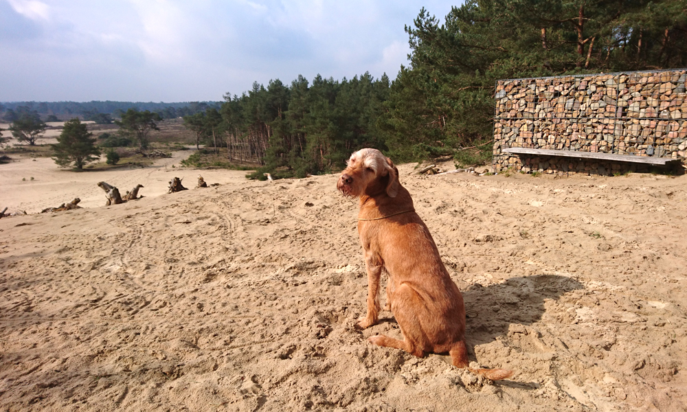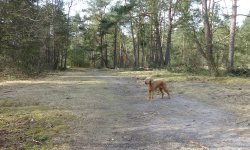 Met ruim 4 kilometer op de teller lopen we het Zandenbos in. Even onthouden dus, want terug vanaf de parkeerplaats is het 3 kilometer. Omdat ik geen water bij me heb nu voor woefje, wil ik naar de Waskolk lopen zodat ze daar even een slokje water kan nemen voordat we weer terug keren. Dat zou dan een rondje van zo’n 16 km worden denk ik.