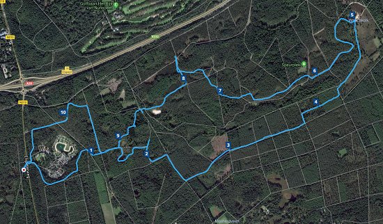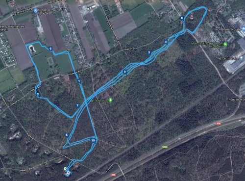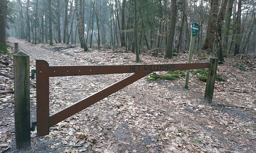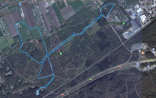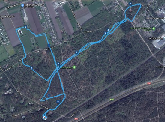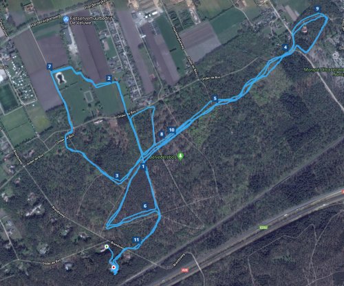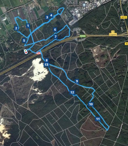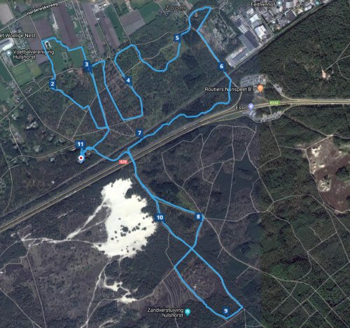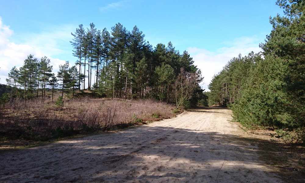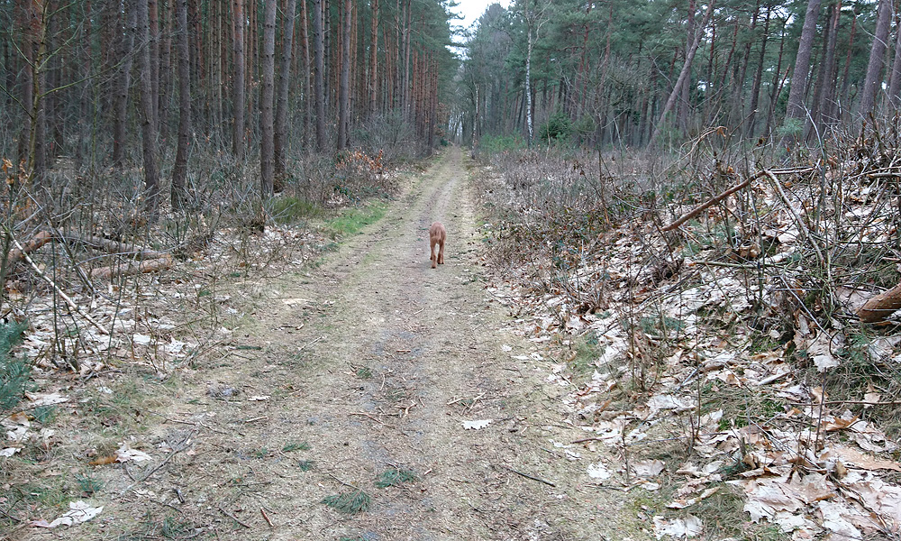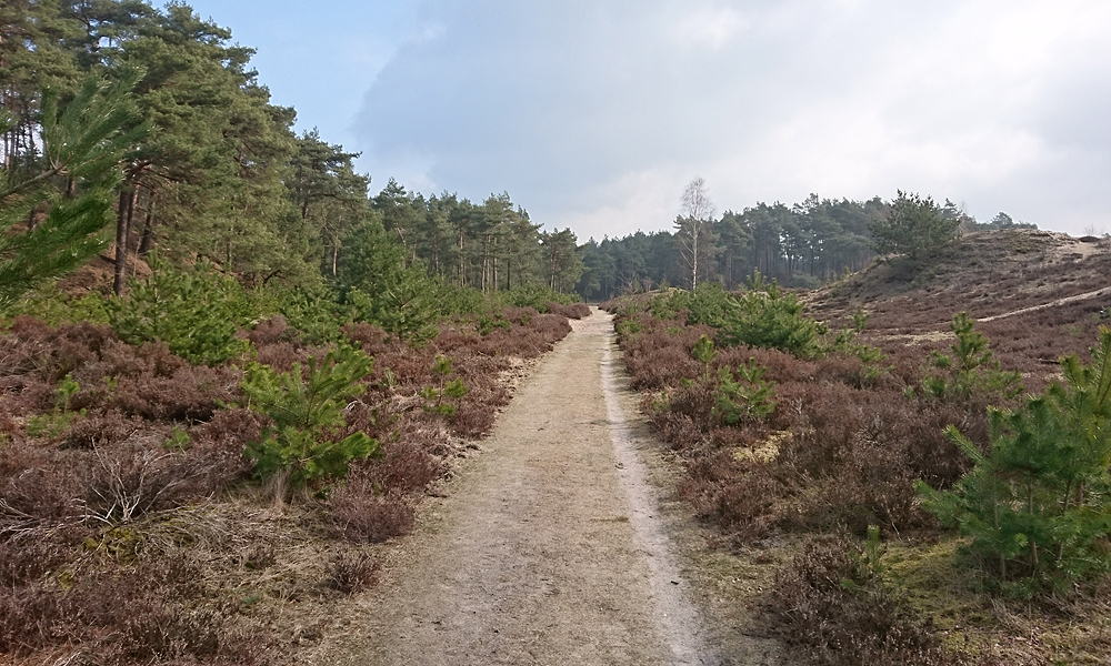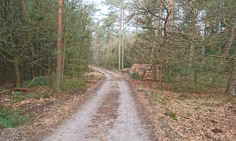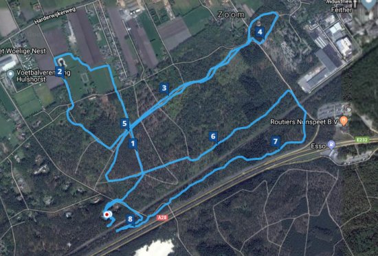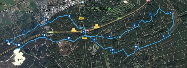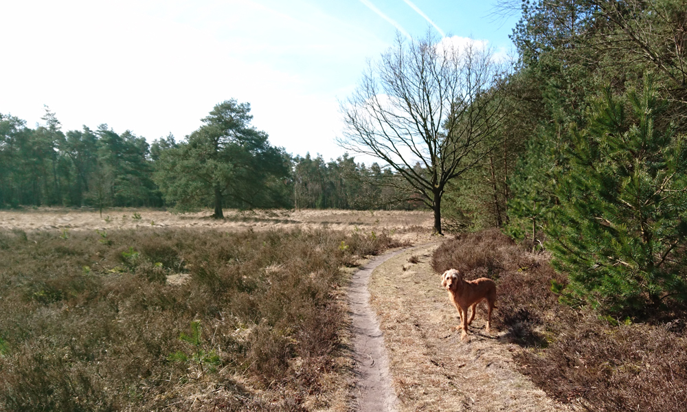 Het lopen voelt eigenlijk fijner dan gedacht en daarom loop ik direct naar de spoorwegovergang aan de andere kant. Vanaf daar ga ik richting de rotonde bij Nunspeet. Ik liep dat eerder op weg naar de Zandenplas maar ik weet nu dat ik beter de weg over kan steken en meteen het Zandenbos in kan lopen zodat woefje lekker los kan. Overigens had ik al bijna een kilometer warming up gedaan in de tuin met het voeren van de vogeltjes en het kijken naar sporen van een mogelijke Das (niet gevonden).
