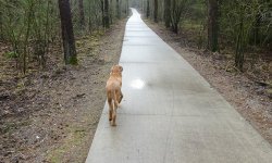 Die gekke hond kijkt daarna weer helemaal gelukkig en kan er duidelijk weer even tegen. Ik heb dus voor mezelf niets bij me maar dat zal wel loslopen. Echt ver is het allemaal niet natuurlijk en ik ben blij dat woef nu weer happy is. Omdat ik een hele ander route heb genomen dan normaal, besluit ik de terugweg te lopen via het pad dat ik eerder als heenweg nam toen S. me afzette bij de parkeerplaats. Ik kom dan weliswaar wat zuidelijker uit dan waar ik moet zijn, maar ik kan makkelijk via het fietspad weer naar de afslag lopen waar ik moet zijn en hoef dan lekker niet op de kaart te kijken. Ook is de route wat beter beloopbaar dan het andere stuk.