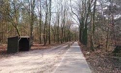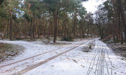 Woef en ik gaan weer verder over het pad. Het is nog steeds prima te doen en nu heb ik de oostenwind in de rug. Maar niet koud want de bomen houden bijna alles tegen. Ik twijfel zelfs of ik nog wel mijn handschoenen aan wil houden. Mijn mouwen stroopte ik al een beetje op. Ik volg het fietspad even naar links en kom aan het einde weer bij een afslag. Vorige week liep ik hier ook en ging ik na ongeveer een kilometer weer rechtsaf en terug naar de start. Maar nu ga ik even op de kaart kijken hoe ver de volgende afslag nou eigenlijk is. Dat wilde ik al eerder lopen maar deed het nog niet. Wel fietsen we hier vorige week toen we richting Leuvenum fietsten. De afslag die ik nu wil nemen, namen we op ons eerste fietsrondje en zal aan het einde bij de beek uitkomen waar woef misschien wat kan drinken. Zal ik het doen? Woef ziet er blij uit en het weer is prima. Ik ben totaal niet koud en het lopen gaat ook prima. We schieten lekker op dus alles staat op groen. Ik ga het doen en dus lopen we door bij de afslag. Ik ben benieuwd. Rechts van me ligt de heide. Dat ziet er prima uit en ik ben benieuwd hoe dat eruit ziet in het najaar. Het fietspad slingert langs de weg en het is vandaag lekker rustig. Ik zie en hoor weinig vogels hier maar misschien komt dat vandaag door de harde wind. Bij de afslag ga ik naar rechts. Ik herken dit inderdaad van een eerder fietsrondje met S. Hij was toen heel moe herinner ik me. Van het pad weet ik eigenlijk niet zoveel dus ik ben benieuwd.