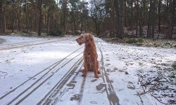 Gisteren heb ik een kort rondje gelopen en vandaag ben ik hartstikke laat. Het is koud en het waait. Toch moet wafje uit en zit ik al klaar in mijn renpakkie dus gaan we maar op stap. Hoe ver ga ik? Neem ik de rugzak mee voor een slokje voor woef? Gisteren ben ik vanwege de sneeuw gevallen en ik ben een beetje beurs. Ik heb er geen last van maar ik heb geen idee of ik goed kan lopen natuurlijk. Laat ik maar gewoon een normaal rondje doen en niet zo ver dan. Geen water mee en gewoon lekker op pad. Ik start in het bos aan de overkant en laat woefje even lekker rennen en plassen. Daarna ga ik direct het natuurgebied in en loop verder over het fietspad. Daar is het prima te lopen en loop ik ook aardig uit de wind. De zon schijnt overigens ook en het is nu totaal niet koud. Wel toen ik vertrok, toen was het bitterkoud en vond ik er niks aan. Maar nu loop ik genietend met wafje over het pad. Er is niemand te zien dus dat is ook heerlijk. Ik schiet trouwens lekker op want als ik op mijn horloge kijk zitten er alweer wat kilometertjes op.
