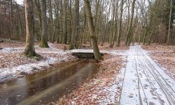 Ik loop rustig verder over het pad en kijk om me heen. Er fietst hier helemaal niemand. Vreemd toch? Het is weliswaar koud maar de zon schijnt en in het bos heb je weinig last van de harde wind. Ik heb zelfs mijn handschoenen zelfs uit. Het laatste stuk terug zal ik wind tegen hebben maar ik hoop dat de bomen dan ook wel wat tegen houden eigenlijk. We lopen verder en wafje wil volgens mij wel een slokje. Bij een rustplaats voor paarden (zo lees ik op het bord) is weliswaar een pomp maar die doet het natuurlijk niet. Wachten op de beek dan maar.