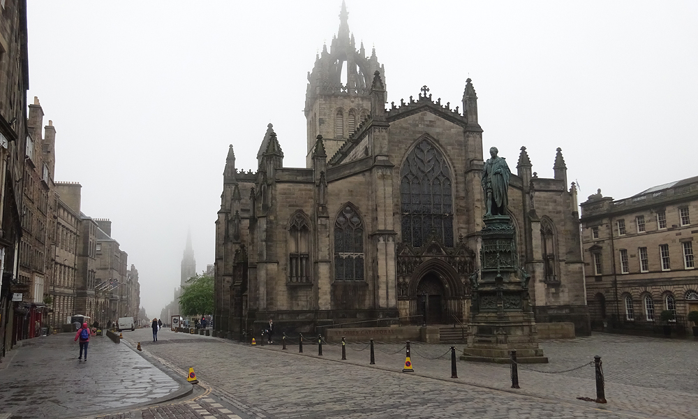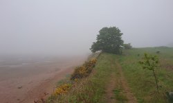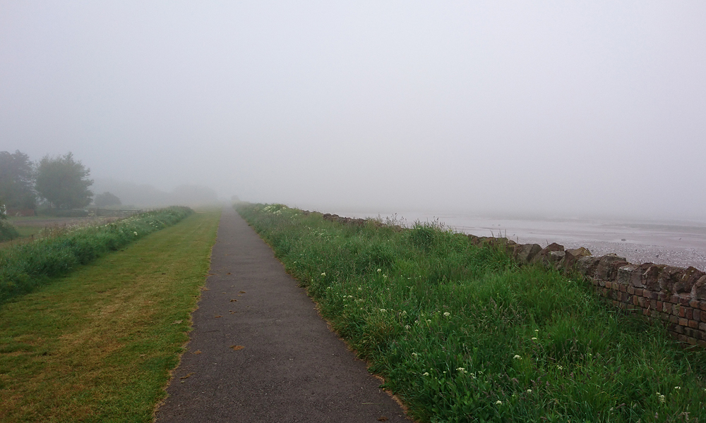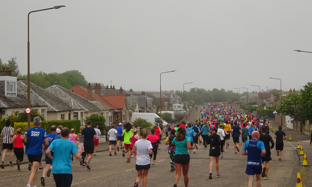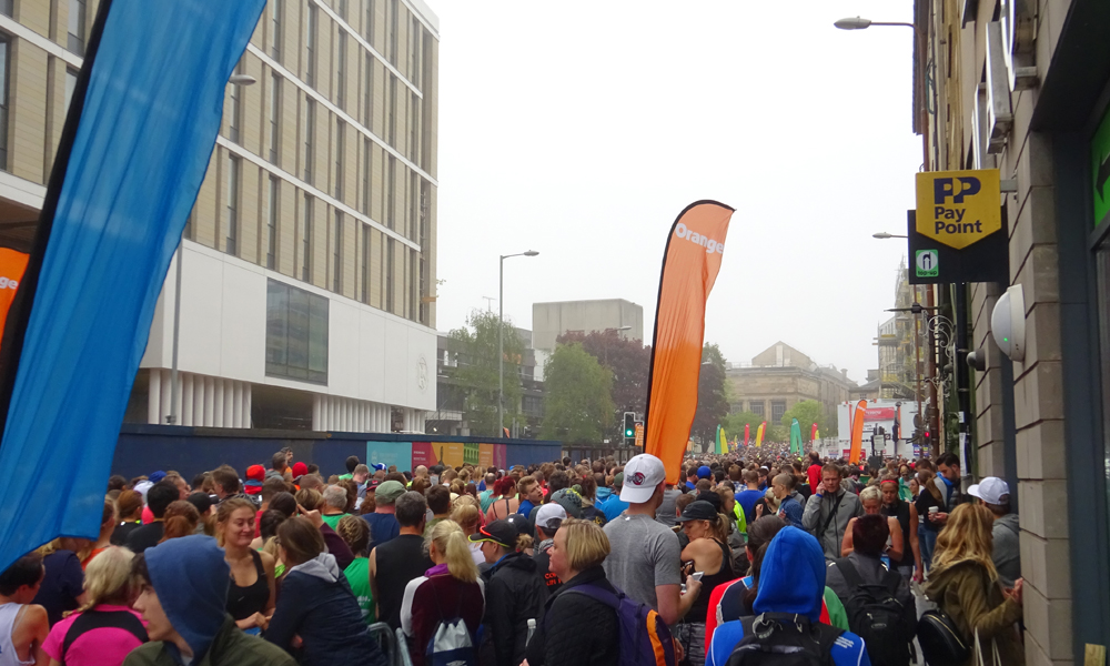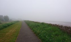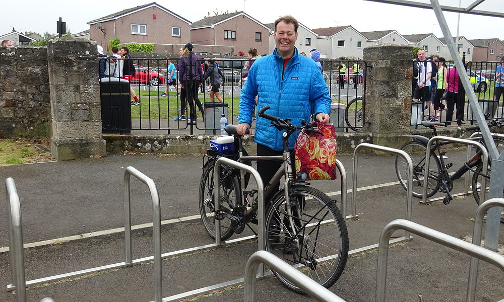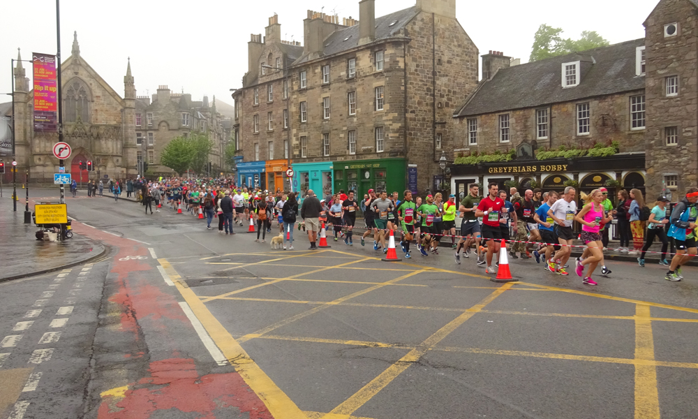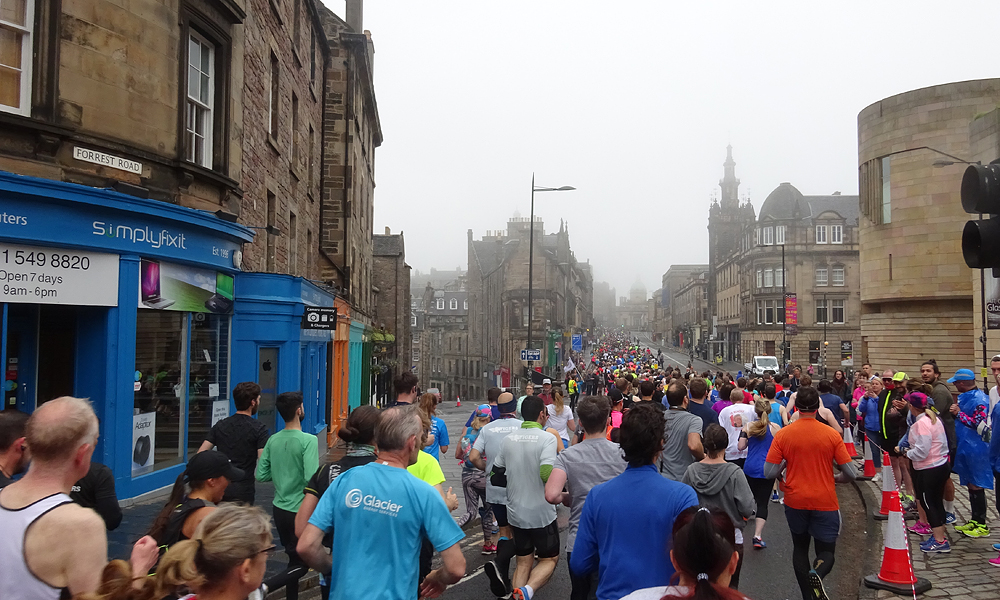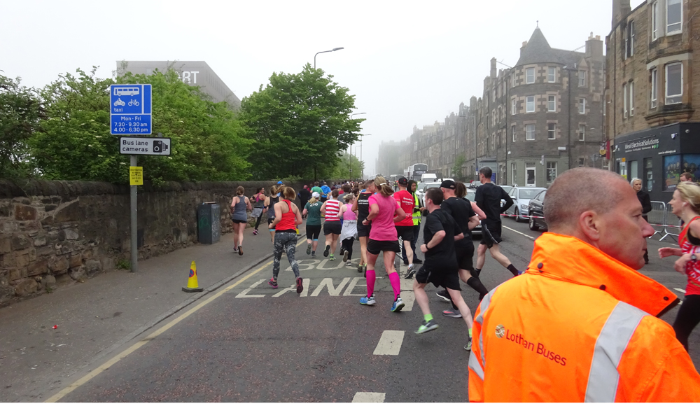 Vanmorgen stond Douglas ruim op tijd voor de deur en zette de fiets in de taxi. Net als voorgaande jaren zou S. bij hem in de taxi meegaan en zouden we eerst naar Musselburgh rijden en proberen te parkeren bij de sportschool. De finish van de run is namelijk in Musselburgh en de start is in Edinburgh. Allemaal heel handig dus. Het is hartstikke mistig als we vertrekken en er is nog geen zon te zien gelukkig. Laat die zon maar even wegblijven want vorig jaar werd het al in de startvakken ineens zonnig en veel te warm.