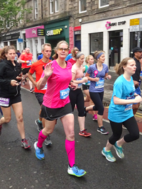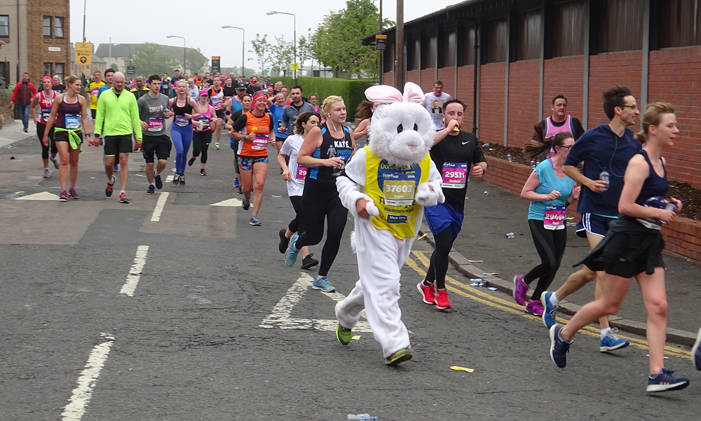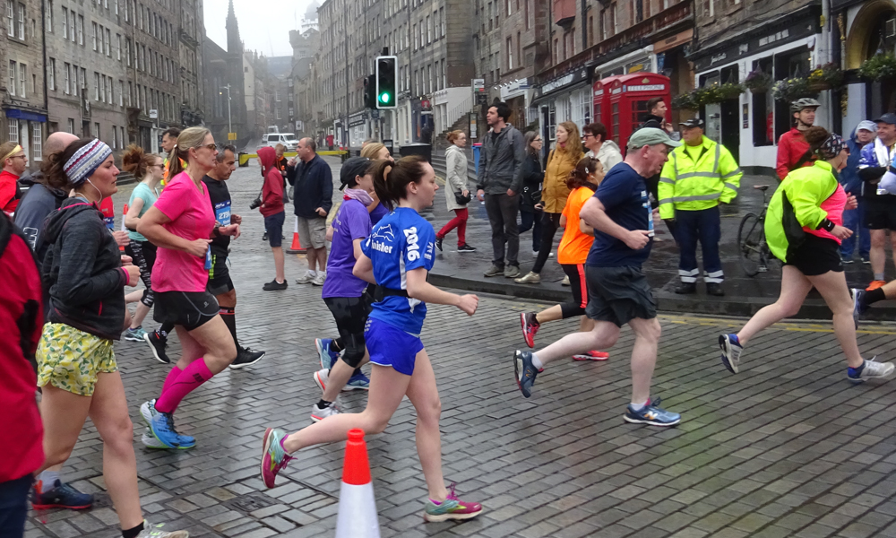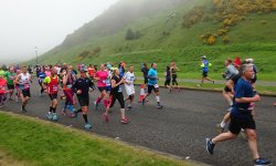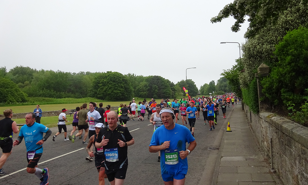 Ik zie S. al ergens onderweg. Lief van hem. Nee ik heb nog niks nodig. De route gaan nu via een andere weg naar Holyrood park. Daar zie ik S weer een keer staan. Lopen gaat nog goed. Vorig jaar had ik meteen al zware poten nu voel ik nog niks eigenlijk. De route gaat langer door het park en het keerpunt ligt dus verder. We draaien weer om. Wind tegen! Dat betekent de rest van de route dus windje tegen maar er staat niet veel. Ik probeer weer achter iemand te gaan hangen. Waarom loopt er nou niemand ongeveer mijn tempo? Dat kan toch helemaal niet? S. fietst mee door het park. Geen idee of dat mag maar hij fietst op het fietspad. Ik zal wel niet achter hem mogen gaan lopen. Dat zou nog eens makkelijk zijn. Maar ik loop rustig door. Ik hoorde van S. dat de brug bij de Shell richting de zee er ook niet meer in zat. Ik ben benieuwd hoe de route nu verder loopt. Ik loop in ieder geval gewoon door.