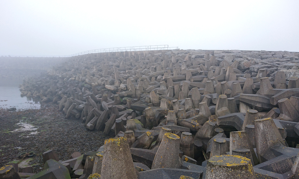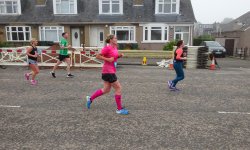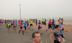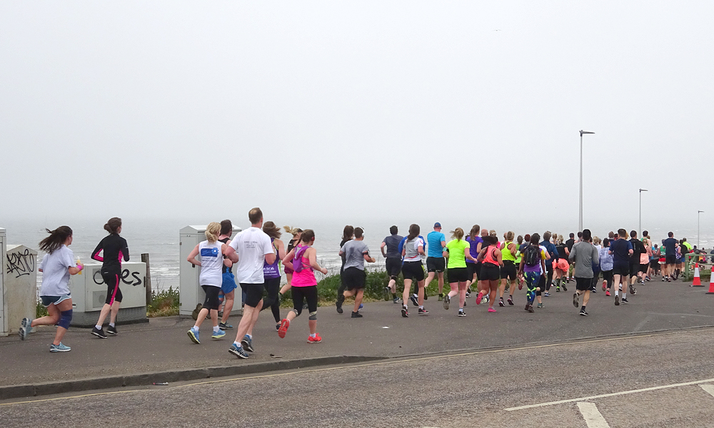 Langs de zee liggen de 10 km matten. Ik loop nog steeds! Ik ben niet eens ontevreden over de tijd. Ik reken wat en reken nog eens. Rond 2.15 zou ik moeten kunnen redden denk ik. Dat is een stuk beter dan vorig jaar maar nog steeds langzaam natuurlijk. Maar vorig jaar was het na de 10 km matten over (door de warmte denk ik). Ik ben toen gaan wandelen en deed 8 minuten over de 11e kilometer. Nu hobbel ik rustig door. Verder langs de zee waar een frisse zijwind staat. De zon laat zich nog steeds niet zien. Gelukkig maar want dat kan ik er niet bij hebben nu. Ik moet doorlopen.
