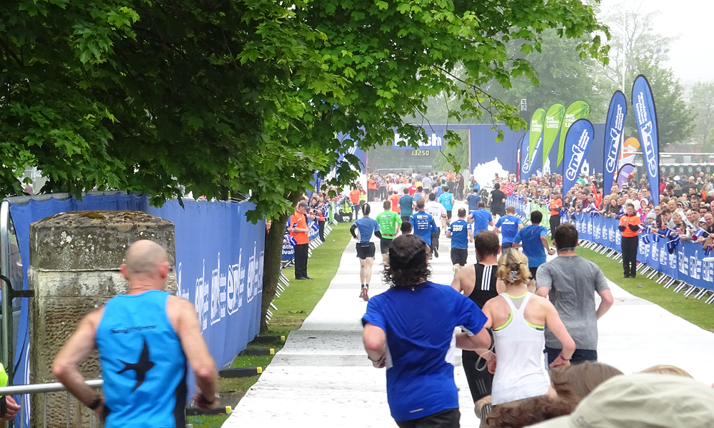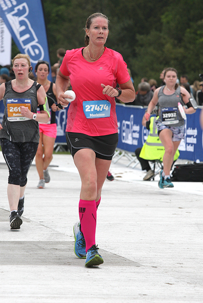 Nog 3 kilometer. Best ver eigenlijk. Hup lopen. Niet stoppen, niet wandelen. Ik loop. Ik loop. Ik gebruik de spons nog een keer. Dat is best lekker zo. Gelukkig is het niet warm geworden en de zon laat zich ook niet zien. De wind is nu in de rug maar hier merk je er niets van. Heb ik dus ook niets aan. Waar is de rotonde nou? Eigenlijk wil ik wel een stukje wandelen. Nee dus. Doorlopen. RWR had gekund maar dan vanaf het begin. Niet meer wandelen als zwaktebod. Lopen. Daar is de rotonde. Veel mensen daar. Ik loop. Rechts de racecourse. Ben ik er al? Waar is de afslag naar de finish nou? Nog een stukje. Reken reken. Ik zie dat ik het niet meer ga halen maar ik wil dan wel binnen die minuut blijven. Maar ik moet nog een kilometer bijna! Hoe kan dat nou? Doorlopen. Hup niet zeuren ook niet vertragen omdat het toch langer duurt. Doorlopen nu. Daar is ergens de afslag en de finish boog is zelfs te zien.